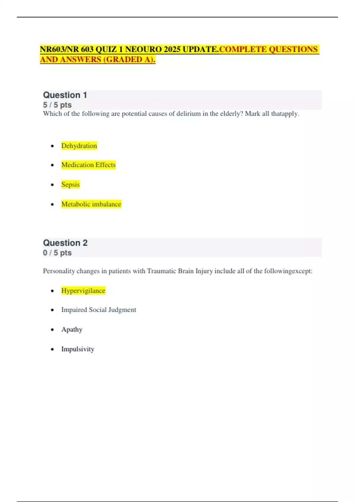 NR603/NR 603 QUIZ 1 NEOURO 2025 UPDATE.COMPLETE QUESTIONS AND ANSWERS (GRADED A). Which of the following are potential causes of delirium in the elderly? Mark all that apply. • Dehydration • Medication Effects • Sepsis • Metabolic imbalance Personality changes in patients with Traumatic Brain Injury include all of the following except: • Hypervigilance • Impaired Social Judgment • Apathy • Impulsivity Common presenting symptoms of dementia include all of the following except: • Depression • Irritability • Inability to find the right words • Abstract thinking increases Which type of medication may be particularly dangerous when treating aggression in patients with traumatic brain injury (TBI) because it could cause paradoxical agitation • Benzodiazepines • Clonidine • Haloperidol • Propranolol