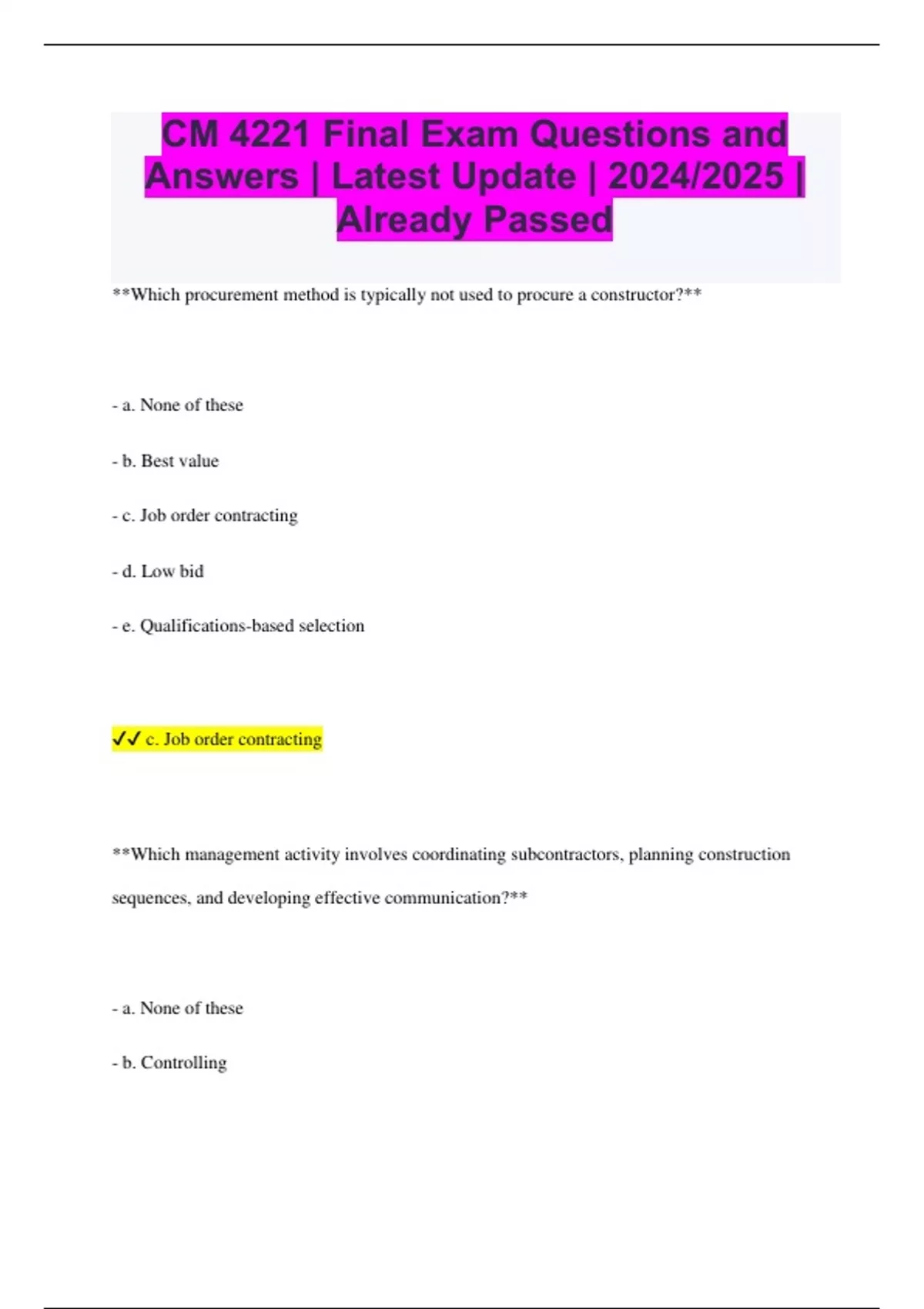 CM 4221 Final Exam Questions and Answers | Latest Update | 2024/2025 | Already Passed **Which procurement method is typically not used to procure a constructor?** - a. None of these - b. Best value - c. Job order contracting - d. Low bid - e. Qualifications-based selection c. Job order contracting **Which management activity involves coordinating subcontractors, planning construction sequences, and developing effective communication?** - a. None of these - b. Controlling - c. Organizing - d. Scoping - e. Planning c. Organizing **Which process aims to ensure major project systems (HVAC, electrical, etc.) operate according to objectives, plans, and specifications?** - a. Commissioning - b. As-builts - c. None of these - d. Notice to Proceed - e. Constructability review a. Commissioning **True or False: Vertical building projects are typically designed by an architect and then engineered by design engineers, while horizontal infrastructure projects are typically designed and engineered by design engineers.** True **Based on laws and regulations, are privately financed projects required to use competitive bidding to procure a construction firm?** - True - False False **True or False: An agency construction manager firm contracts with the Owner, lead designer, and construction firm on