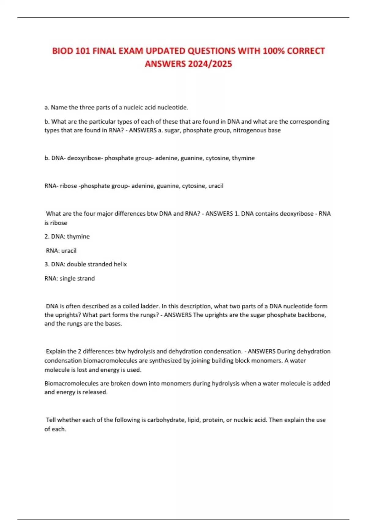 BIOD 101 FINAL EXAM UPDATED QUESTIONS WITH 100% CORRECT ANSWERS 2024/2025 a. Name the three parts of a nucleic acid nucleotide. b. What are the particular types of each of these that are found in DNA and what are the corresponding types that are found in RNA? - ANSWERS a. sugar, phosphate group, nitrogenous base b. DNA- deoxyribose- phosphate group- adenine, guanine, cytosine, thymine RNA- ribose -phosphate group- adenine, guanine, cytosine, uracil What are the four major differences btw DNA and RNA? - ANSWERS 1. DNA contains deoxyribose - RNA is ribose 2. DNA: thymine RNA: uracil 3. DNA: double stranded helix RNA: single strand DNA is often described as a coiled ladder. In this description, what two parts of a DNA nucleotide form the uprights? What part forms the rungs? - ANSWERS The uprights are the sugar phosphate backbone, and the rungs are the bases. Explain the 2 differences btw hydrolysis and dehydration condensation. - ANSWERS During dehydration condensation biomacromolecules are synthesized by joining building block monomers. A water molecule is lost and energy is used. Biomacromolecules are broken down into monomers during hydrolysis when a water molecule is added and energy is released. Tell whether each of the following is carbohydrate, lipid, protein, or nucleic acid. Then explain the use of each. GLUCOSE - ANSWERS Carbohydrate; used as fuel, is referred to as blood sugar in humans and animals Tell whether each of the following is carbohydrate, lipid, protein, or nucleic acid. Then explain the use of each. Starch - ANSWERS Carbohydrate; the form in which plants store glucose Tell whether each of the following is carbohydrate, lipid, protein, or nucleic acid. Then explain the use of each. Cellulose - ANSWERS Carbohydrate; woody tissue in plants and trees, indigestible fiber Tell whether each of the following is carbohydrate, lipid, protein, or nucleic acid. Then explain the use of each. Triglyceride - ANSWERS Lipid; the major form of fuel storage that when broken down produces twice as much energy per gram than carbohydrates Tell whether each of the following is carbohydrate, lipid, protein, or nucleic acid. Then explain the use of each. Phopholipid - ANSWERS Lipid; the major constituent of cell membranes Tell whether each of the following is carbohydrate, lipid, protein, or nucleic acid. Then explain the use of each. Hemoglobin - ANSWERS Protein; carries oxygen in the blood Tell whether each of the following is carbohydrate, lipid, protein, or nucleic acid. Then explain the use of each. DNA - ANSWERS Nucleic Acid; contains genetic material of cells Tell whether each of the following is carbohydrate, lipid, protein, or nucleic acid. Then explain the use of each. RNA - ANSWERS Nucleic Acid; part of the protein-synthesizing operation of the cell Tell whether each of the following is carbohydrate, lipid, protein, or nucleic acid. Then explain the use of each. Cholesterol - ANSWERS Lipid; component of animal cell membranes that, when in excess, can form plaque on artery walls Tell whether each of the following is carbohydrate, lipid, protein, or nucleic acid. Then explain the use of each. ATP - ANSWERS Nucleic Acid; releases energy through the breaking of high-energy phosphate bond Tell whether each of the following is carbohydrate, lipid, protein, or nucleic acid. Then explain the use of each