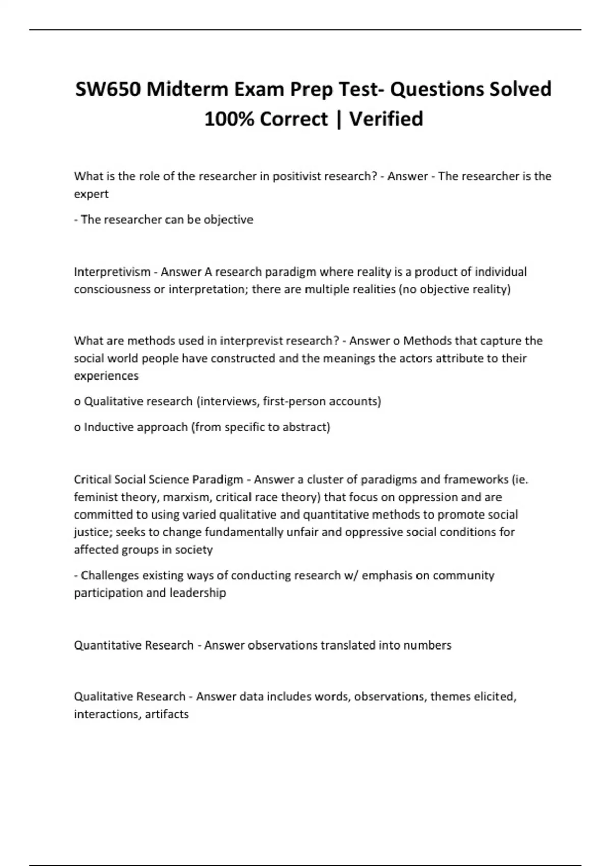 SW650 Midterm Exam Prep Test- Questions Solved 100% Correct | Verified