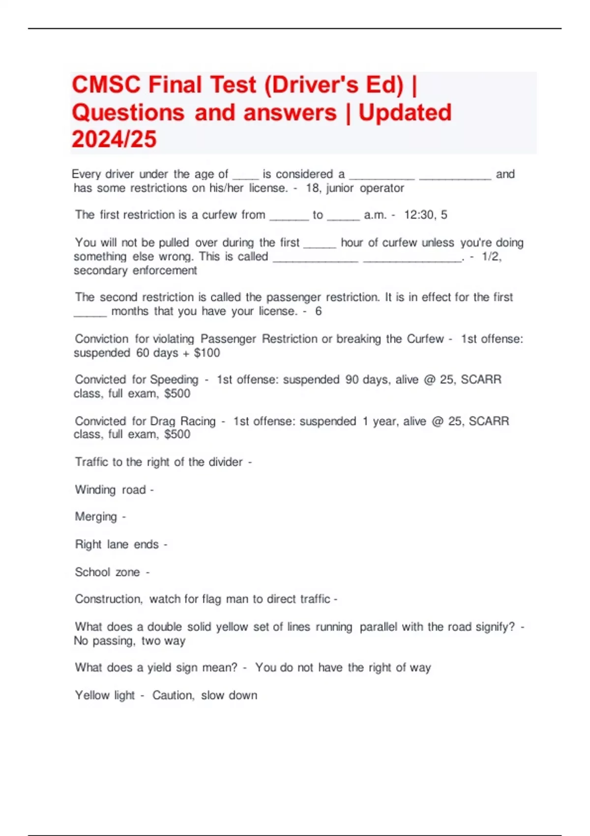 CMSC Final Test (Driver's Ed) | Questions and answers | Updated 2024/25