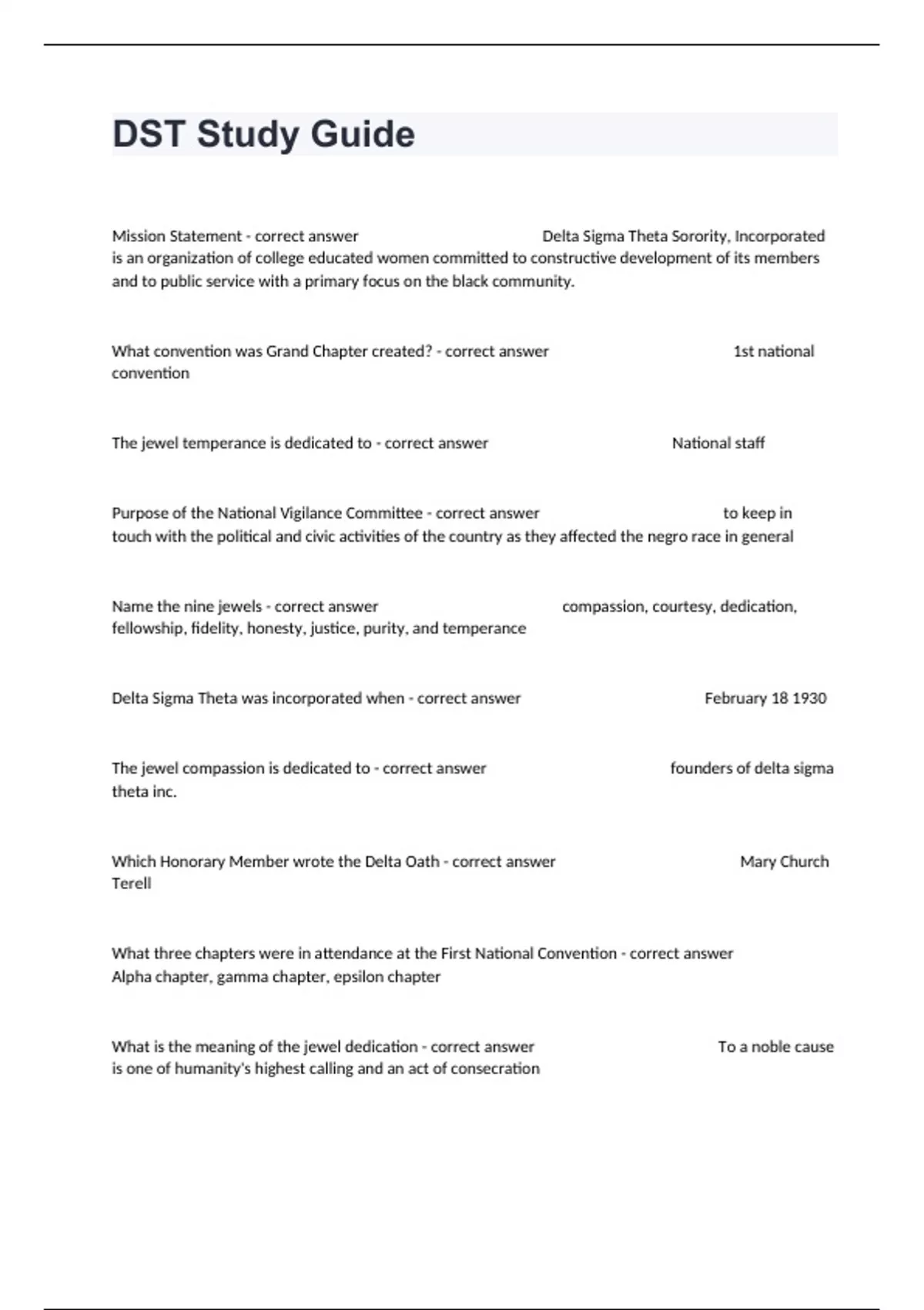 Mission Statement - correct answer Delta Sigma Theta Sorority, Incorporated is an organization of college educated women committed to constructive development of its members and to public service with a primary focus on the black community. What convention was Grand Chapter created? - correct answer 1st national convention The jewel temperance is dedicated to - correct answer National staff Purpose of the National Vigilance Committee - correct answer to keep in touch with the political and civic activities of the country as they affected the negro race in general Name the nine jewels - correct answer compassion, courtesy, dedication, fellowship, fidelity, honesty, justice, purity, and temperance Delta Sigma Theta was incorporated when - correct answer February 18 1930 The jewel compassion is dedicated to - correct answer founders of delta sigma theta inc. Which Honorary Member wrote the Delta Oath - correct answer Mary Church Terell What three chapters were in attendance at the First National Convention - correct answer Alpha chapter, gamma chapter, epsilon chapter What is the meaning of the jewel dedication - correct answer To a noble cause is one of humanity's highest calling and an act of consecration What components make up the Minerva Circle of Identity - correct answer Sisterhood, black, college, women, public service Who designed the sorority crest - correct answer F. Ailene Marks and Jeanette Triplett Jones On what university campus was Delta Sigma Theta Sorority founded - correct answer Howard University Writers of the Delta National Hymn - correct answer Alice Dunbar Nelson and Florence Cole Talbert What were the first two graduate chapters authorized by Delta Sigma Theta - correct answer Alpha Beta and Beta Beta Purpose of the Jubilee Year established in 1929 - correct answer Jubilee year was established with hopes that hundreds of Delta women would rededicate themselves to the sorority's ideals and become active participants in its programs Four funds established under First National President Sadie T. Mossell Alexander - correct answer Housing fund, sinking fund, the scholarship award fund, and college tuition fund How many principles provide the overall framework for all of the initiation activities - correct answer Nine First honorary member initiated into Delta Sigma Theta - correct answer Gabrielle Pelham- mother of G. Dorothy Pelham Beckly At what convention was Mary McLeod Bethune initiated? - correct answer 5th convention in December of 1923 The jewels representing the nine cardinal values are located on which Greek letter on the Delta Pin? - correct answer Sigma Complete the following statement from the Delta Oath: I will close my ears - correct answer and seal my lips to slanderous gossip Complete the following statement from the Delta Oath: I will take an active interest in the welfare - correct answer of my country, using my influence toward the enactment of laws for the protection of the unfortunate and weak and for the repeal of those depriving human beings of their privileges and rights Complete the following statement from the Delta Oath: I will never belittle any race - correct answer and will try to persuade others to take the same just stand Born in El Paso, Texas; featured in the Crisis Magazine in 1913; reporter for the Alpha chapter; gifted singer - correct answer Zephyr Chisom Carter Mother of five daughters, four of whom became Deltas; member of the Baltimore Branch of the National Association of College Women; first public high school in U.S. Dunbar High School - correct answer Vashti Turley Murphy First of the Founders to enter into the Omega Omega Chapter on Feb. 17, 1919; from Beta, SC - correct answer Mamie Reddy Rose First Custodian (Historian) of the Alpha Chapter; was the first Black of the Alpha Chapter; was the first Black social worker with New York City and New York County charitees - correct answer Winona Cargile Alexander Presented First Lady Eleanor Roosevelt to parents at the John Wesley AME Zion Church in 1945; had interactions with multiple US presidents including William H. Taft and John F. Kennedy - correct answer Florence Letcher Toms Accomplished pianist who taught school in Washington, D.C. - correct answer Olive Jones The first Vice President of Alpha Chapter; first Black teacher in Richmond County, NY; charter member of the Queens Alumnae Chapter - correct answer Ethel Cuff Black Served as the Recording Secretary of the Alpha Chapter; taught at Claflin College in Oragneburg, S.C. - correct answer Edith Motte Young Founder who selected the Delta mottoes; an acclaimed actress and directress of the America Negro Theater; directress of Harlem School of Arts - correct answer Osceola Macarthy Adams Graduated magna cum laude from Howard University; received her M.A. and Ph.D - correct answer Eliza Pearl Shippen The only Black student enrolled at her school; was the valedictorian of the Class of 1908; born in Kansas; participated in 1913 March on Washington - correct answer Bertha Pitts Campbell Last surviving founder in 1933; the first black graduate of Washingtonville High School; married a member of Alpha Phi Alpha - correct answer Naomi Sewell Richardson Born in Illinois; constant supporter of Alpha Chapter; helped Alpha Nu chapter in the purchase of the sorority house on the campus of the university of Illinois - correct answer Marguerite Young Alexander Accomplished linguist who spoke German, French, Greek, and Latin; designed ceremony for inducting honorary members; first woman of the campus paper, The Howard University Journal - correct answer Madree Penn White President and valedictorian of her graduating class; married a founder of Omega Psi Phi Fraternity, Inc. - correct answer Edna Brown Coleman