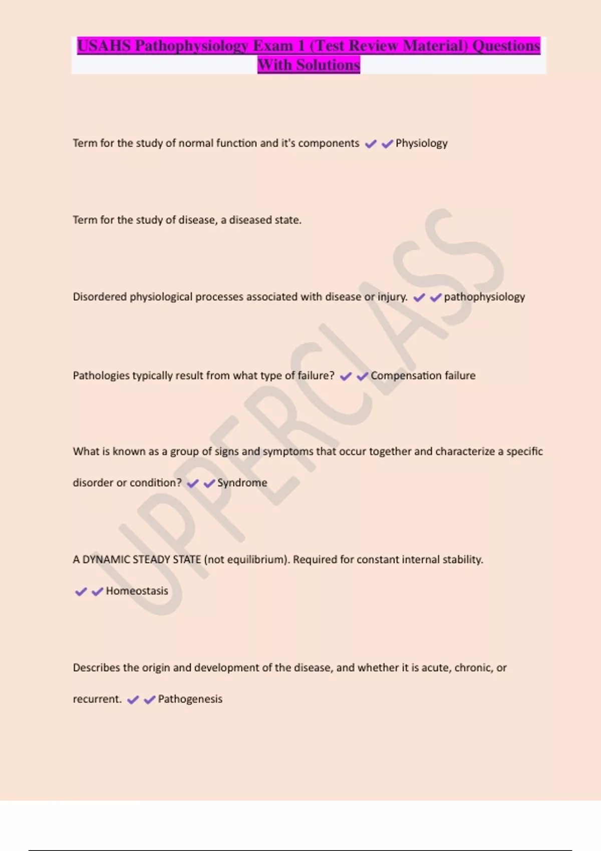 USAHS Pathophysiology Exam 1 (Test Review Material) Questions With Solutions Term for the study of normal function and it's components Physiology Term for the study of disease, a diseased state. Disordered physiological processes associated with disease or injury. pathophysiology Pathologies typically result from what type of failure? Compensation failure What is known as a group of signs and symptoms that occur together and characterize a specific disorder or condition? Syndrome