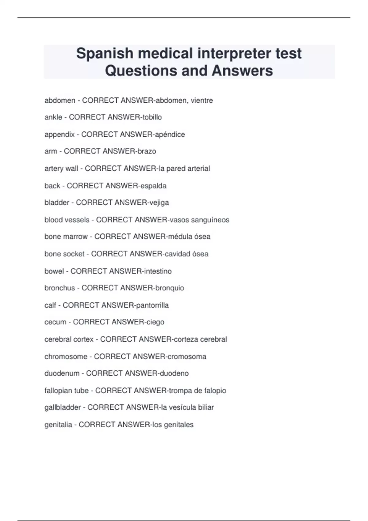 Spanish medical interpreter test Questions and Answers abdomen - CORRECT ANSWER-abdomen, vientre ankle - CORRECT ANSWER-tobillo appendix - CORRECT ANSWER-apéndice arm - CORRECT ANSWER-brazo artery wall - CORRECT ANSWER-la pared arterial back - CORRECT ANSWER-espalda bladder - CORRECT ANSWER-vejiga blood vessels - CORRECT ANSWER-vasos sanguíneos bone marrow - CORRECT ANSWER-médula ósea bone socket - CORRECT ANSWER-cavidad ósea bowel - CORRECT ANSWER-intestino bronchus - CORRECT ANSWER-bronquio calf - CORRECT ANSWER-pantorrilla cecum - CORRECT ANSWER-ciego