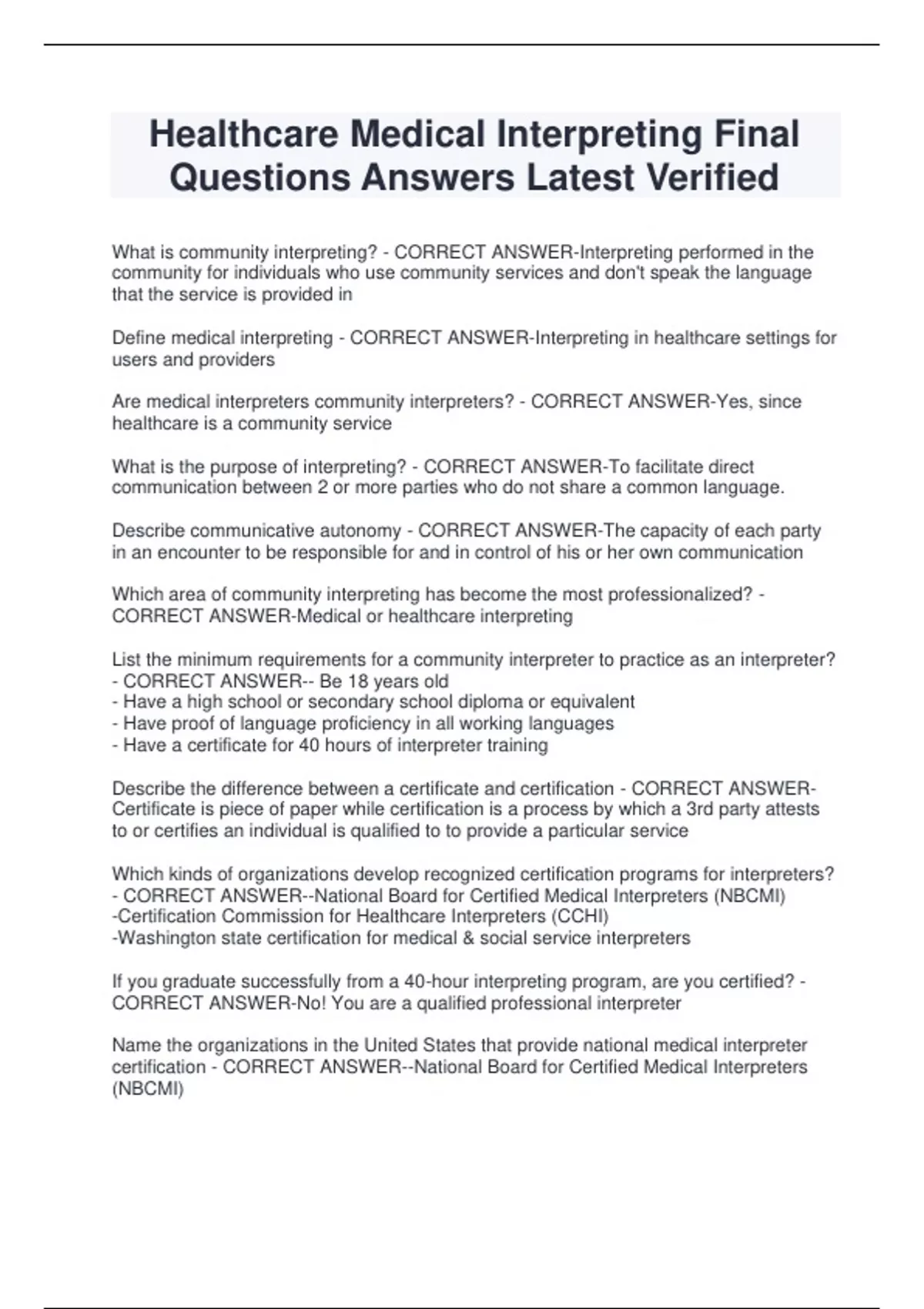 certification - CORRECT ANSWER--National Board for Certified Medical Interpreters