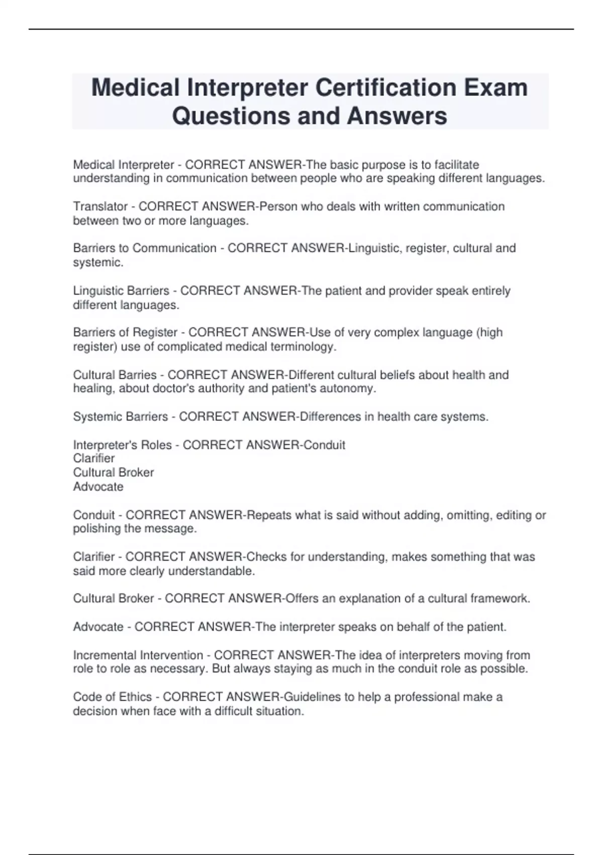 Medical Interpreter Certification Exam Questions and Answers Medical Interpreter - CORRECT ANSWER-The basic purpose is to facilitate understanding in communication between people who are speaking different languages. Translator - CORRECT ANSWER-Person who deals with written communication between two or more languages. Barriers to Communication - CORRECT ANSWER-Linguistic, register, cultural and systemic. Linguistic Barriers - CORRECT ANSWER-The patient and provider speak entirely different languages. Barriers of Register - CORRECT ANSWER-Use of very complex language (high register) use of complicated medical terminology. Cultural Barries - CORRECT ANSWER-Different cultural beliefs about health and healing, about doctor's authority and patient's autonomy. Systemic Barriers - CORRECT ANSWER-Differences in health care systems. Interpreter's Roles - CORRECT ANSWER