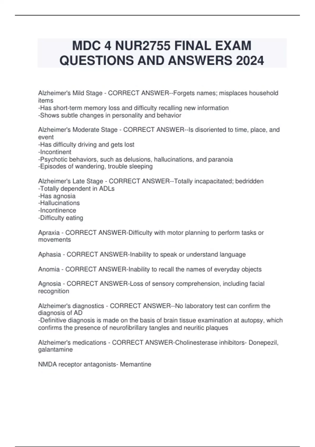 MDC 4 NUR2755 FINAL EXAM QUESTIONS AND ANSWERS 2024 Alzheimer's Mild Stage - CORRECT ANSWER--Forgets names; misplaces household items -Has short-term memory loss and difficulty recalling new information -Shows subtle changes in personality and behavior Alzheimer's Moderate Stage - CORRECT ANSWER--Is disoriented to time, place, and event -Has difficulty driving and gets lost -Incontinent -Psychotic behaviors, such as delusions, hallucinations, and paranoia -Episodes of wandering, trouble sleeping Alzheimer's Late Stage - CORRECT ANSWER--Totally incapacitated; bedridden -Totally dependent in ADLs -Has agnosia -Hallucinations -Incontinence -Difficulty eating Apraxia - CORRECT ANSWER-Difficulty with motor planning to perform tasks or movements Aphasia - CORRECT ANSWER-Inability to speak or understand language Anomia - CORRECT ANSWER-Inability to recall the names of everyday objects Agnosia - CORRECT ANSWER-Loss of sensory comprehension, including facial recognition Alzheimer's diagnostics - CORRECT ANSWER--No laboratory test can confirm the diagnosis of AD -Definitive diagnosis is made on the basis of brain tissue examination at autopsy, which confirms the presence of neurofibrillary tangles and neuritic plaques Alzheimer's medications - CORRECT ANSWER-Cholinesterase inhibitors- Donepezil, galantamine NMDA receptor antagonists- Memantine
