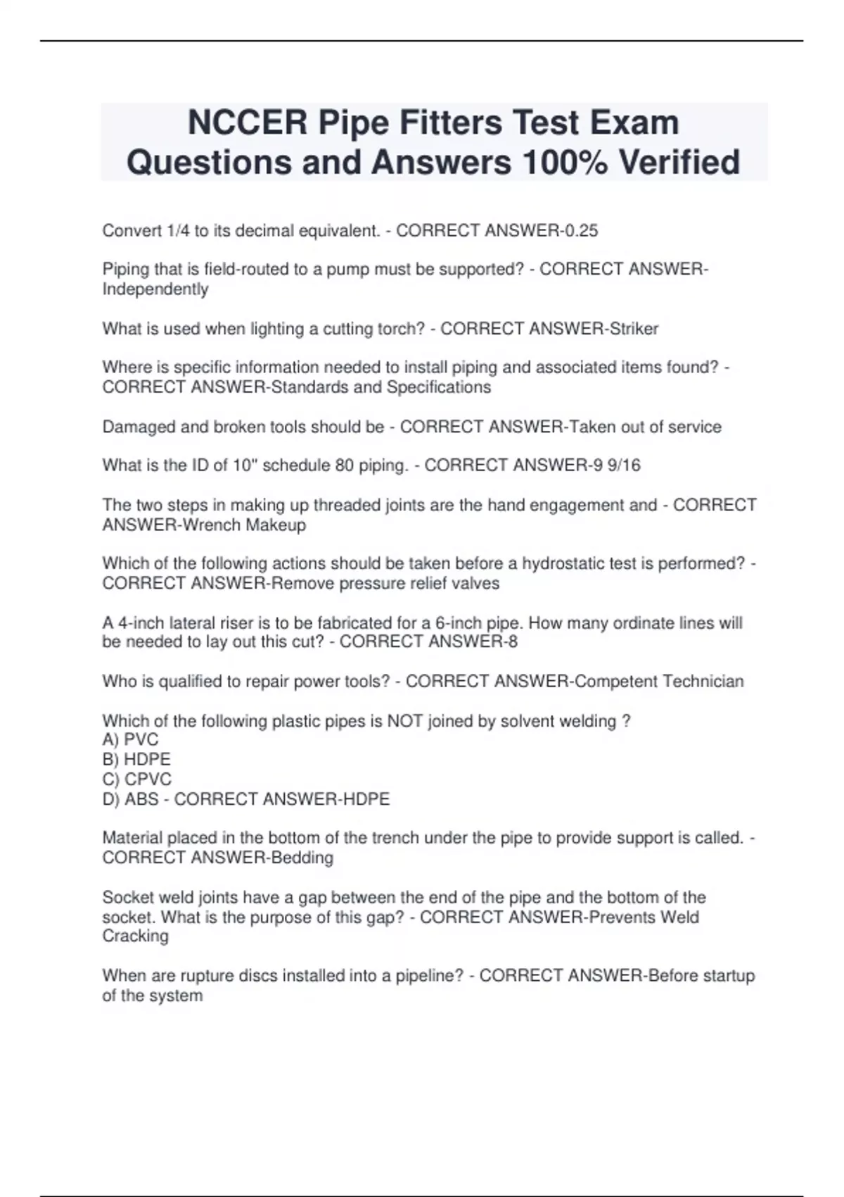 NCCER Pipe Fitters Test Exam Questions and Answers 100% Verified Convert 1/4 to its decimal equivalent. - CORRECT ANSWER-0.25 Piping that is field-routed to a pump must be supported? - CORRECT ANSWER Independently What is used when lighting a cutting torch? - CORRECT ANSWER-Striker Where is specific information needed to install piping and associated items found? - CORRECT ANSWER-Standards and Specifications Damaged and broken tools should be - CORRECT ANSWER-Taken out of service What is the ID of 10'' schedule 80 piping. - CORRECT ANSWER-9 9/16 The two steps in making up threaded joints are the hand engagement and - CORRECT ANSWER-Wrench Makeup Which of the following actions should be taken before a hydrostatic test is performed? - CORRECT ANSWER-Remove pressure relief valves A 4-inch lateral riser is to be fabricated for a 6-inch pipe. How many ordinate lines will be needed to lay out this cut? - CORRECT ANSWER-8 Who is qualified to repair power tools? - CORRECT ANSWER-Competent Technician Which of the following plastic pipes is NOT joined by solvent welding ? A) PVC B) HDPE C) CPVC D) ABS - CORRECT ANSWER-HDPE Material placed in the bottom of the trench under the pipe to provide support is called. - CORRECT ANSWER-Bedding Socket weld joints have a gap between the end of the pipe and the bottom of the socket. What is the purpose of this gap? - CORRECT ANSWER-Prevents Weld Cracking When are rupture discs installed into a pipeline? - CORRECT ANSWER-Before startup of the system Chain come-alongs are PRIMARILY designed for? - CORRECT ANSWER-Vertical Lifting Which of the following types of copper tubing has the thickest wall - CORRECT ANSWER-K What is the MINIMUM grade of chain that may be used for rigging loads overhead? - CORRECT ANSWER-8 At and above what norminal pipe size is the O.D. of the pipe the same as the norminal size of the pipe. - CORRECT ANSWER-14"