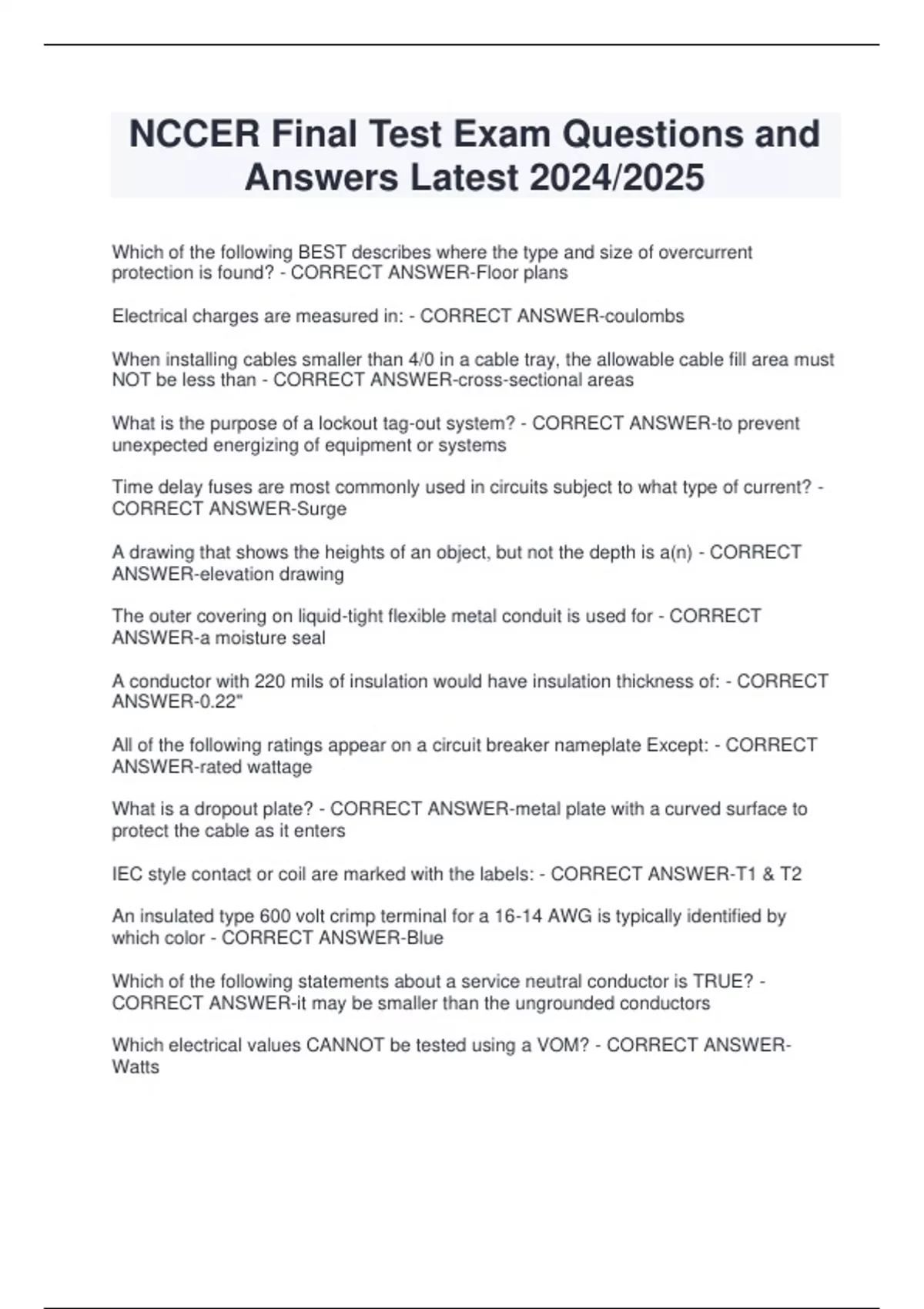 NCCER Final Test Exam Questions and Answers Latest 2024/2025 Which of the following BEST describes where the type and size of overcurrent protection is found? - CORRECT ANSWER-Floor plans Electrical charges are measured in: - CORRECT ANSWER-coulombs When installing cables smaller than 4/0 in a cable tray, the allowable cable fill area must NOT be less than - CORRECT ANSWER-cross-sectional areas What is the purpose of a lockout tag-out system? - CORRECT ANSWER-to prevent unexpected energizing of equipment or systems Time delay fuses are most commonly used in circuits subject to what type of current? - CORRECT ANSWER-Surge A drawing that shows the heights of an object, but not the depth is a(n) - CORRECT ANSWER-elevation drawing The outer covering on liquid-tight flexible metal conduit is used for - CORRECT ANSWER-a moisture seal A conductor with 220 mils of insulation would have insulation thickness of: - CORRECT ANSWER-0.22" All of the following ratings appear on a circuit breaker nameplate Except: - CORRECT ANSWER-rated wattage What is a dropout plate? - CORRECT ANSWER-metal plate with a curved surface to protect the cable as it enters IEC style contact or coil are marked with the labels: - CORRECT ANSWER-T1 & T2 An insulated type 600 volt crimp terminal for a 16-14 AWG is typically identified by which color - CORRECT ANSWER-Blue Which of the following statements about a service neutral conductor is TRUE? - CORRECT ANSWER-it may be smaller than the ungrounded conductors Which electrical values CANNOT be tested
