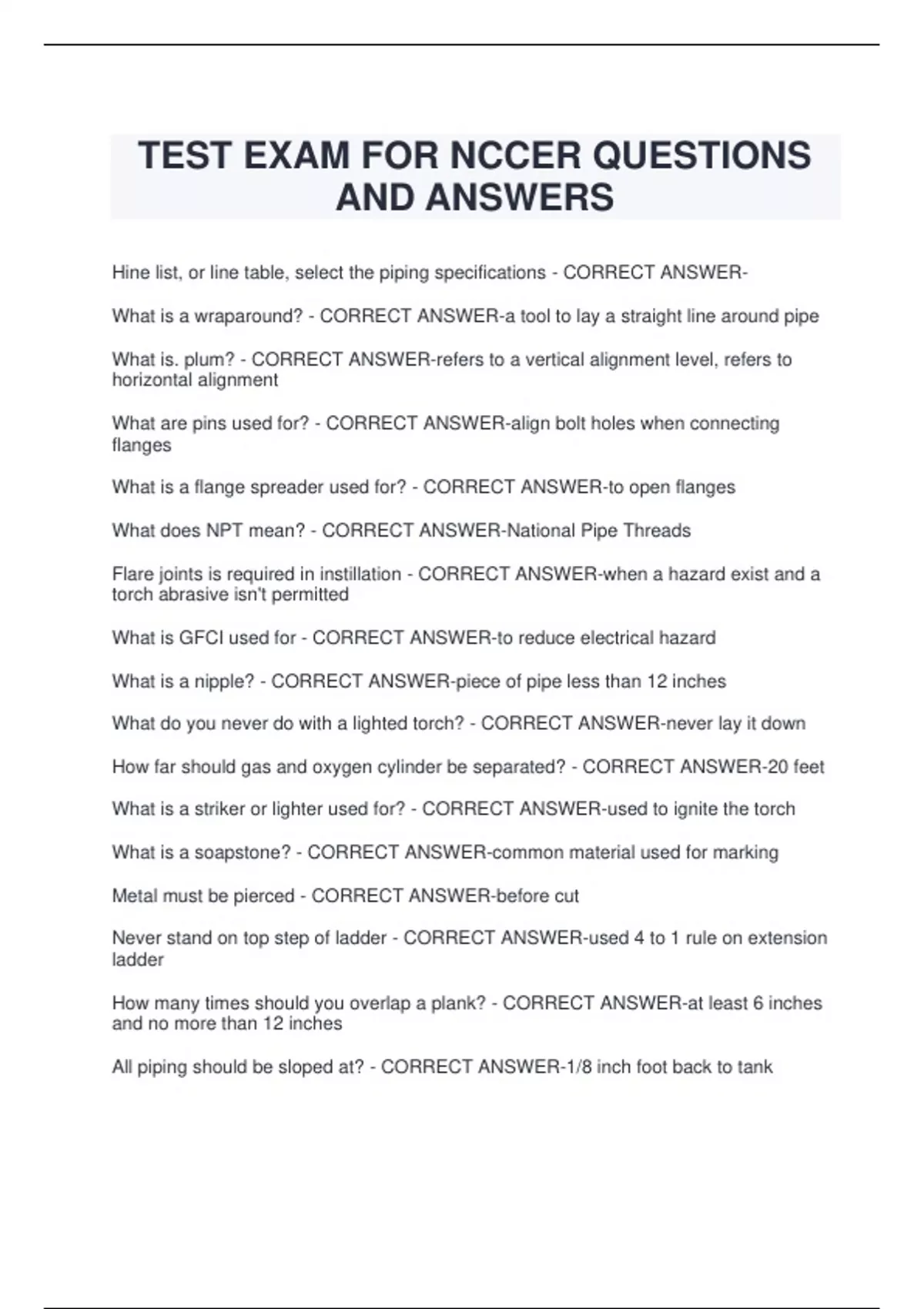 TEST EXAM FOR NCCER QUESTIONS AND ANSWERS Hine list, or line table, select the piping specifications - CORRECT ANSWER- What is a wraparound? - CORRECT ANSWER-a tool to lay a straight line around pipe What is. plum? - CORRECT ANSWER-refers to a vertical alignment level, refers to horizontal alignment What are pins used for? - CORRECT ANSWER-align bolt holes when connecting flanges What is a flange spreader used for? - CORRECT ANSWER-to open flanges What does NPT mean? - CORRECT ANSWER-National Pipe Threads Flare joints is required in instillation - CORRECT ANSWER-when a hazard exist and a torch abrasive isn't permitted What is GFCI used for - CORRECT ANSWER-to reduce electrical hazard What is a nipple? - CORRECT ANSWER-piece of pipe less than 12 inches What do you never do with a lighted torch? - CORRECT ANSWER-never lay it down How far should gas and oxygen cylinder be separated? - CORRECT ANSWER-20 feet What is a striker or lighter used for? - CORRECT ANSWER-used to ignite the torch What is a soapstone? - CORRECT ANSWER-common material used for ma