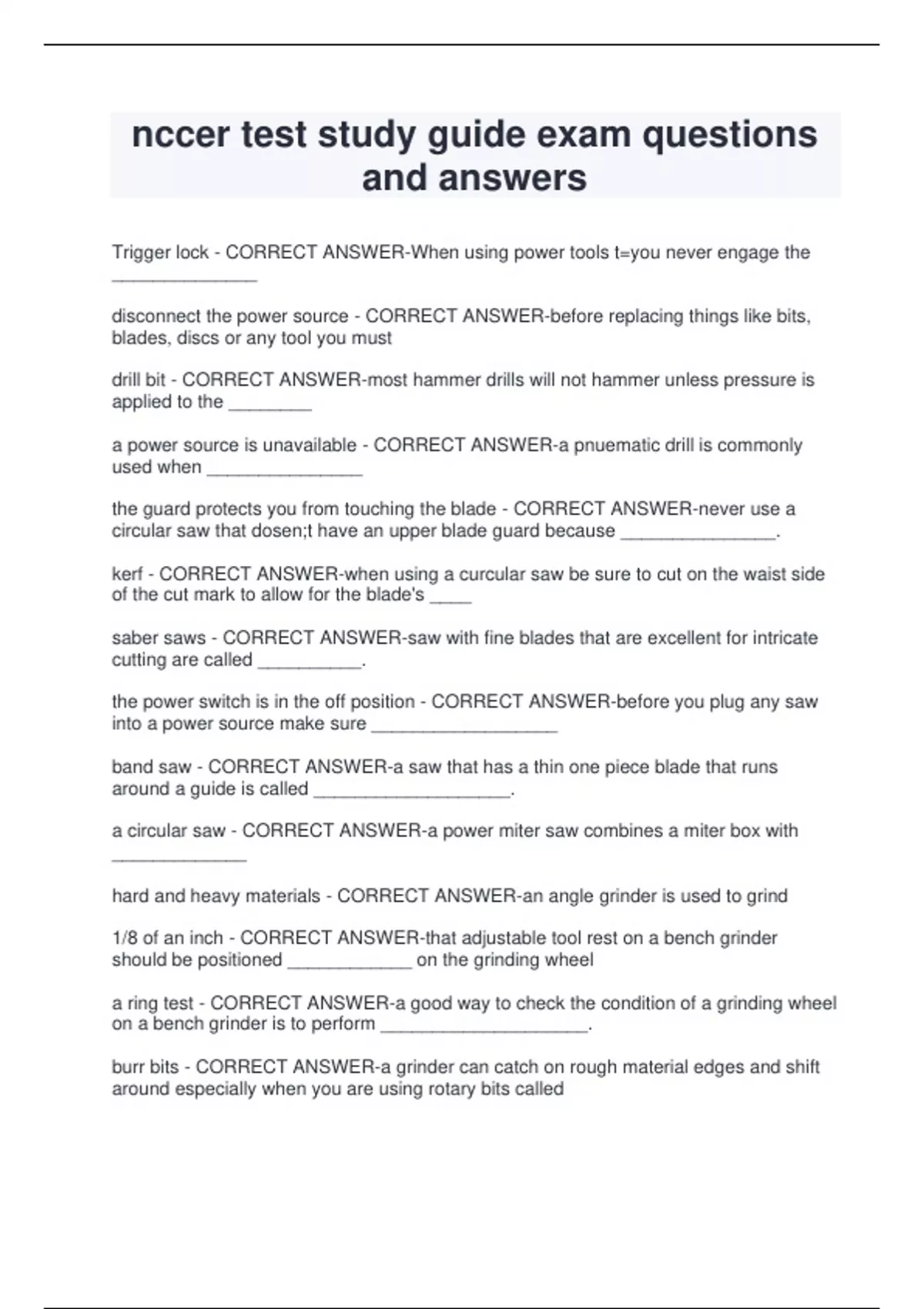 nccer test study guide exam questions and answers Trigger lock - CORRECT ANSWER-When using power tools t=you never engage the ______________ disconnect the power source - CORRECT ANSWER-before replacing things like bits, blades, discs or any tool you must drill bit - CORRECT ANSWER-most hammer drills will not hammer unless pressure is applied to the ________ a power source is unavailable - CORRECT ANSWER-a pnuematic drill is commonly used when _______________ the guard protects you from touching the blade - CORRECT ANSWER-never use a circular saw that dosen;t have an upper blade guard because _______________. kerf - CORRECT ANSWER-when using a curcular saw be sure to cut on the waist side of the cut mark to allow for the blade's ____ saber saws - CORRECT ANSWER-saw with fine blades that are excellent for intricate cutting are called __________. the power switch is in the off position - CORRECT ANSWER-before you plug any saw into a power source make sure __________________ band saw - CORRECT ANSWER-a saw that has a thin one piece blade that runs around a guide is called ___________________. a circular saw - CORRECT ANSWER-a power miter saw combines a miter box with _____________ hard and heavy materials - CORRECT ANSWER-an angle grinder is used to grind 1/8 of an inch - CORRECT ANSWER-that adjustable tool rest on a bench grinder should be positioned ____________ on the grinding wheel a ring test - CORRECT ANSWER-a good way to chec