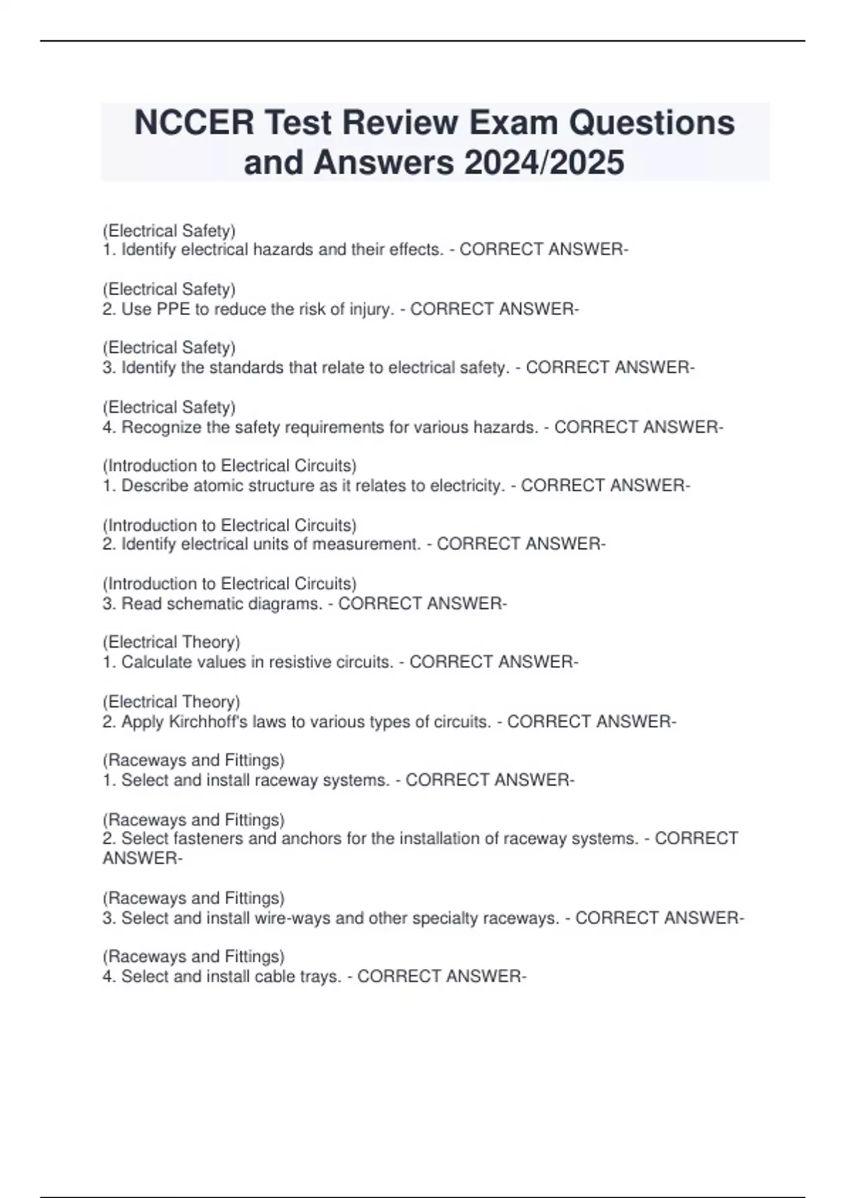 NCCER Test Review Exam Questions and Answers 2024/2025 (Electrical Safety) 1. Identify electrical hazards and their effects. - CORRECT ANSWER- (Electrical Safety) 2. Use PPE to reduce the risk of injury. - CORRECT ANSWER- (Electrical Safety) 3. Identify the standards that relate to electrical safety. - CORRECT ANSWER- (Electrical Safety) 4. Recognize the safety requirements for various hazards. - CORRECT ANSWER- (Introduction to Electrical Circuits) 1. Describe atomic structure as it relates to electricity. - CORRECT ANSWER- (Introduction to Electrical Circuits) 2. Identify electrical units of measurement. - CORRECT ANSWER- (Introduction to Electrical Circuits) 3. Read schematic diagrams. - CORRECT ANSWER- (Electrical Theory) 1. Calculate values in resistive circuits. - CORRECT ANSWER- (Electrical Theory) 2. Apply Kirchhoff's laws to various types of circuits. - CORRECT ANSWER- (Raceways and Fittings) 1. Select and install raceway systems. - CORRE