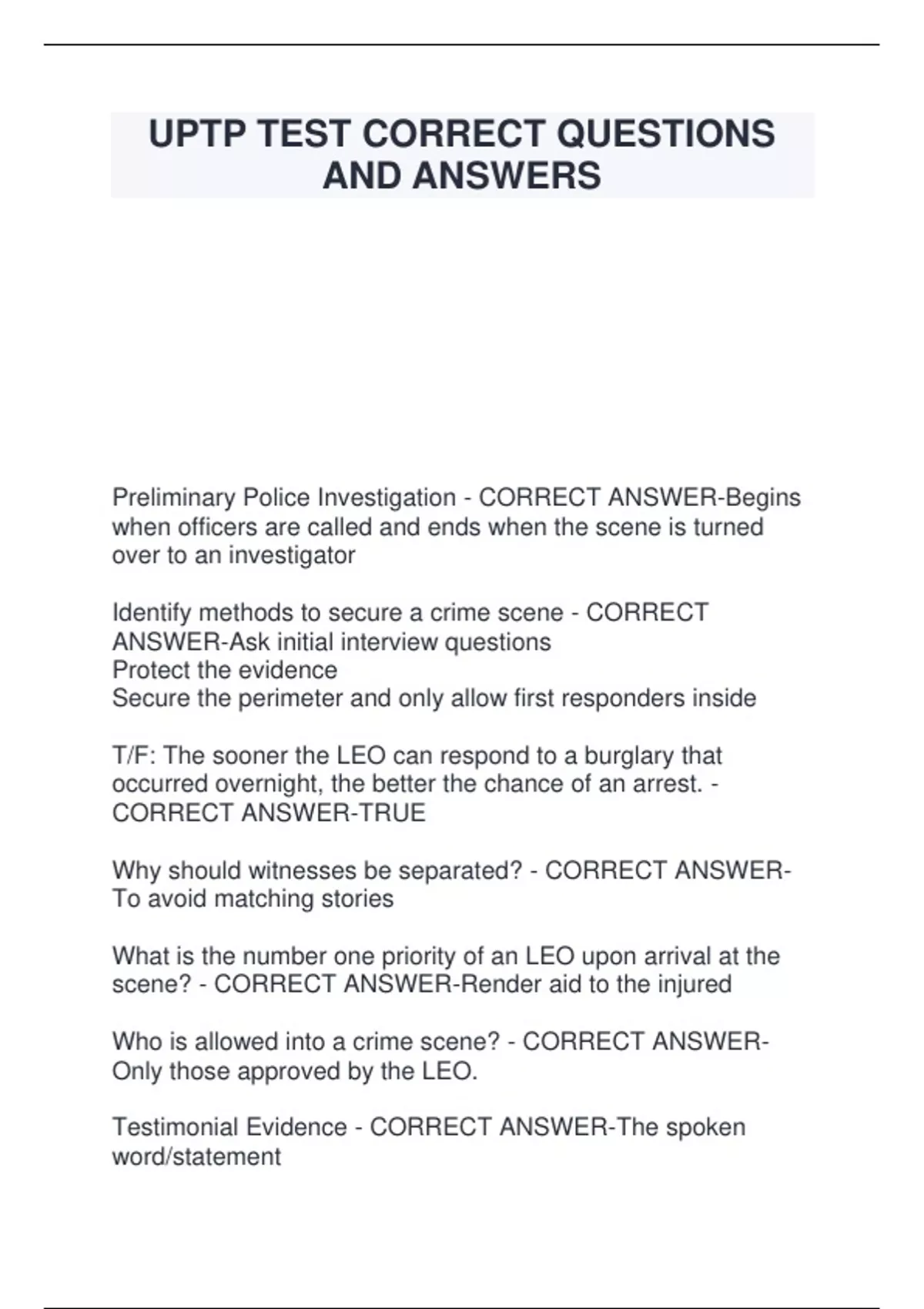 UPTP TEST CORRECT QUESTIONS AND ANSWERS Preliminary Police Investigation - CORRECT ANSWER-Begins when officers are called and ends when the scene is turned over to an investigator Identify methods to secure a crime scene - CORRECT ANSWER-Ask initial interview questions Protect the evidence Secure the perimeter and only allow first responders inside T/F: The sooner the LEO can respond to a burglary that occurred overnight, the better the chance of an arrest. - CORRECT ANSWER-TRUE Why should witnesses be separated? - CORRECT ANSWER To avoid matching stories What is the number one priority of an LEO upon arrival at the scene? - CORRECT ANSWER-Render aid to the injured Who is allowed into a crime scene? - CORRECT ANSWER Only those approved by the LEO.