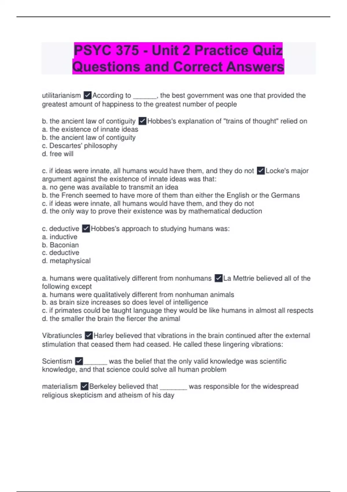 utilitarianism According to ______, the best government was one that provided the greatest amount of happiness to the greatest number of people b. the ancient law of contiguity Hobbes's explanation of "trains of thought" relied on a. the existence of innate ideas b. the ancient law of contiguity c. Descartes' philosophy d. free will c. if ideas were innate, all humans would have them, and they do not Locke's major argument against the existence of innate ideas was that: a. no gene was available to transmit an idea b. the French seemed to have more of them than either the English or the Germans c. if ideas were innate, all humans would have them, and they do not d. the only way to prove their existence was by mathematical deduction c. deductive Hobbes's approach to studying humans was: a. inductive b. Baconian c. deductive d. metaphysical a. humans were qualitatively different from nonhumans La Mettrie believed all of the following except a. humans were qualitatively different from nonhuman animals b. as brain size increases so does level of intelligence c. if primates could be taught language they would be like humans in almost all respects d. the smaller the brain the fiercer the animal Vibratiuncles Harley believed that vibrations in the brain continued after the external stimulation that ceased them had ceased. He called these lingering vibrations: Scientism ______ was the belief that the only valid knowledge was scientific knowledge, and that science could solve all human problem materialism Berkeley believed that _______ was responsible for the widespread religious skepticism and atheism of his day
