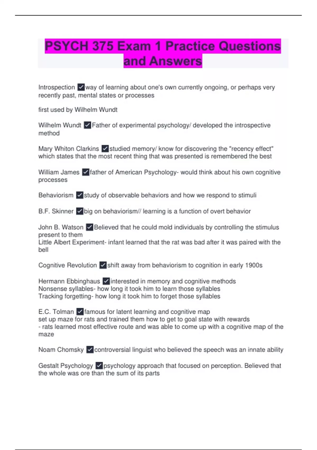 PSYCH 375 Exam 1 Practice Questions and Answers