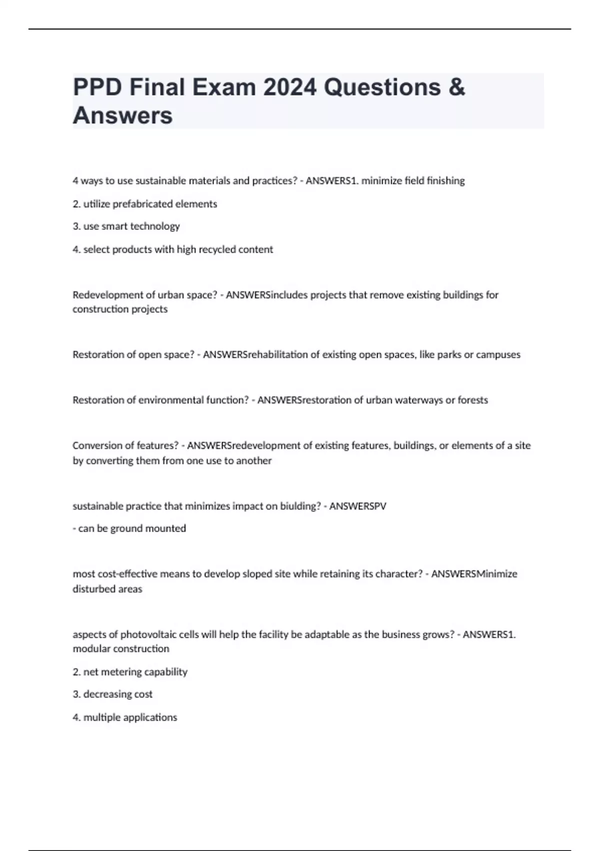 PPD Final Exam 2024 Questions & Answers 4 ways to use sustainable materials and practices? - ANSWERS1. minimize field finishing 2. utilize prefabricated elements 3. use smart technology 4. select products with high recycled content Redevelopment of urban space? - ANSWERSincludes projects that remove existing buildings for construction projects Restoration of open space? - ANSWERSrehabilitation of existing open spaces, like parks or campuses Restoration of environmental function? - ANSWERSrestoration of urban waterways or forests Conversion of features? - ANSWERSredevelopment of existing features, buildings, or elements of a site by converting them from one use to another sustainable practice that minimizes impact on biulding? - ANSWERSPV - can be ground mounted most cost-effective means to develop sloped site while retaining its character? - ANSWERSMinimize disturbed areas aspects of photovoltaic cells will help the facility be adaptable as the business grows? - ANSWERS1. modular construction 2. net metering capability 3. decreasing cost 4. multiple applications