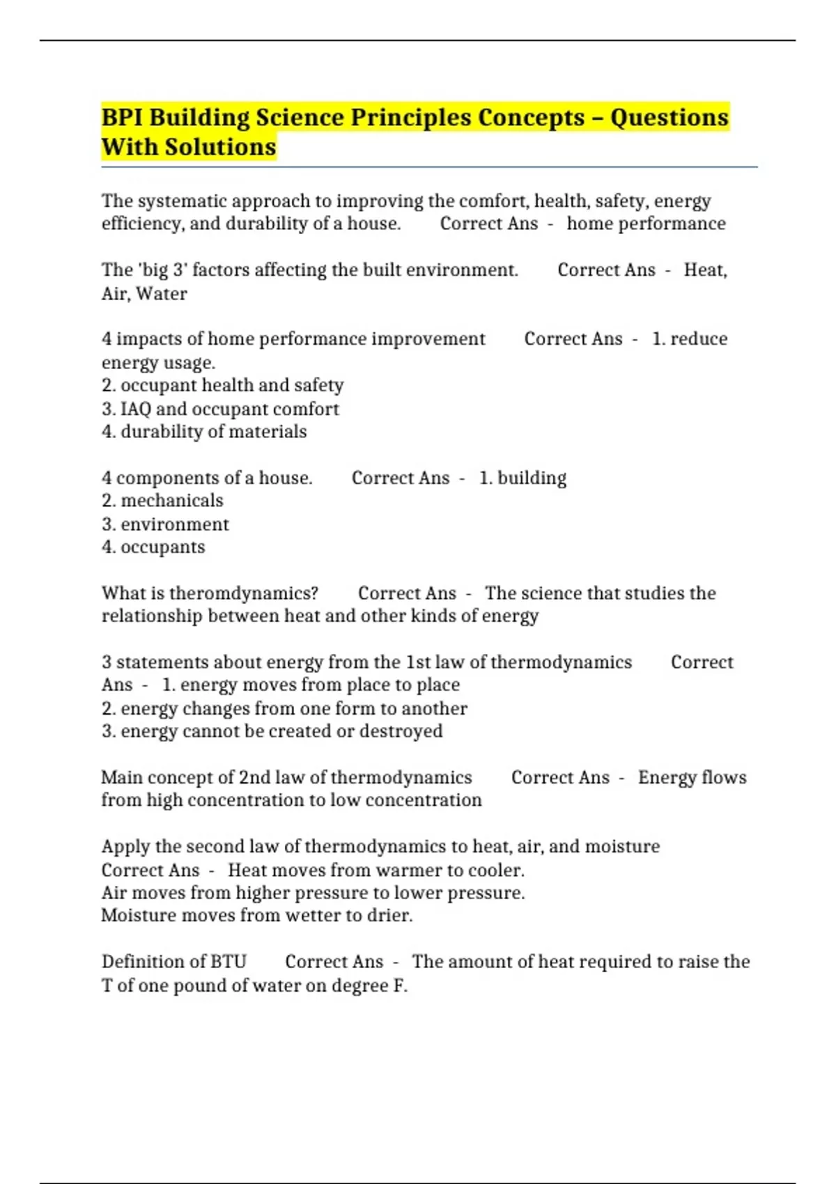 BPI Building Science Principles Concepts – Questions With Solutions