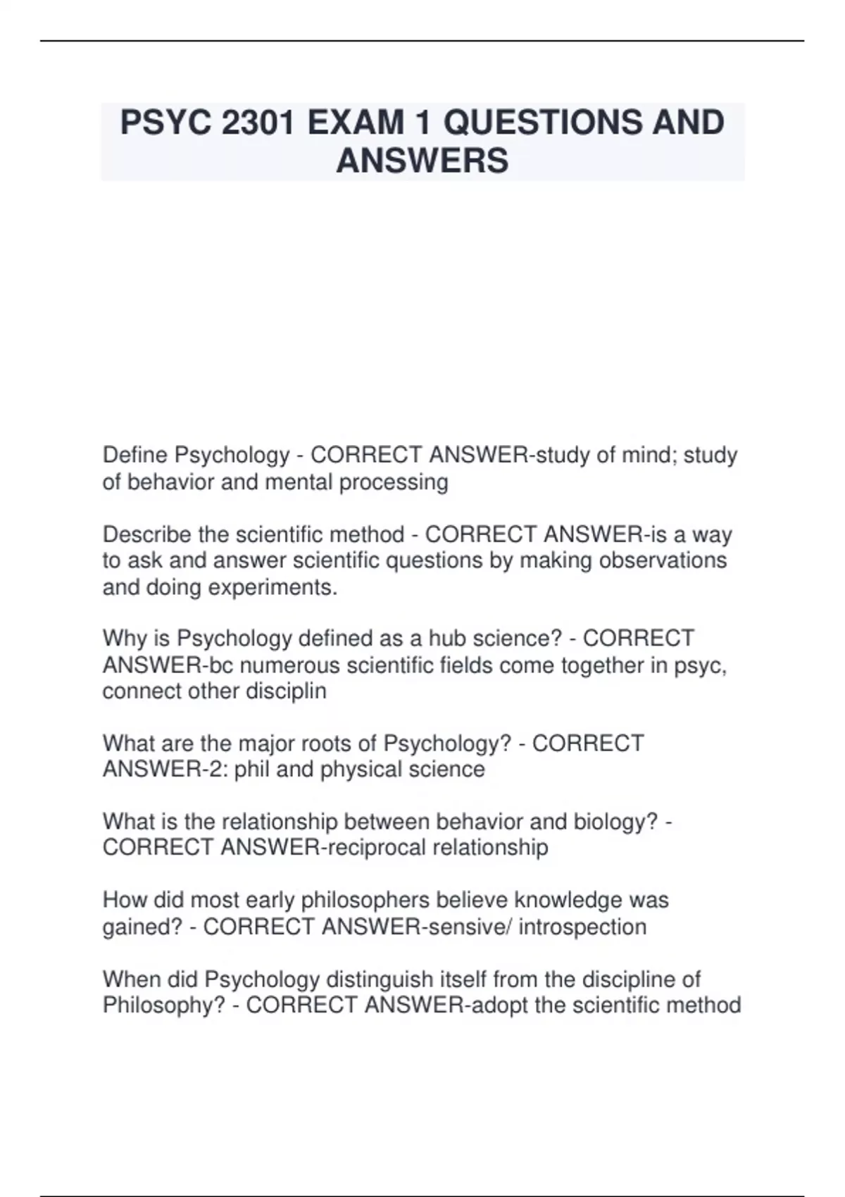 PSYC 2301 EXAM 1 QUESTIONS AND ANSWERS Define Psychology - CORRECT ANSWER-study of mind; study of behavior and mental processing Describe the scientific method - CORRECT ANSWER-is a way to ask and answer scientific questions by making observations and doing experiments. Why is Psychology defined as a hub science? - CORRECT ANSWER-bc numerous scientific fields come together in psyc, connect other disciplin What are the major roots of Psychology? - CORRECT ANSWER-2: phil and physical science What is the relationship between behavior and biology? - CORRECT ANSWER-reciprocal relationship How did most early philosophers believe knowledge was gained? - CORRECT ANSWER-sensive/ introspection When did Psychology distinguish itself from the discipline of Philosophy? - CORRECT ANSWER-adopt the scientific method Who conducted the first experiment in psychology? - CORRECT ANSWER-wilhelm wundt Define structuralism - CORRECT ANSWER-Structuralism is the study of the parts and elements that make up the mi