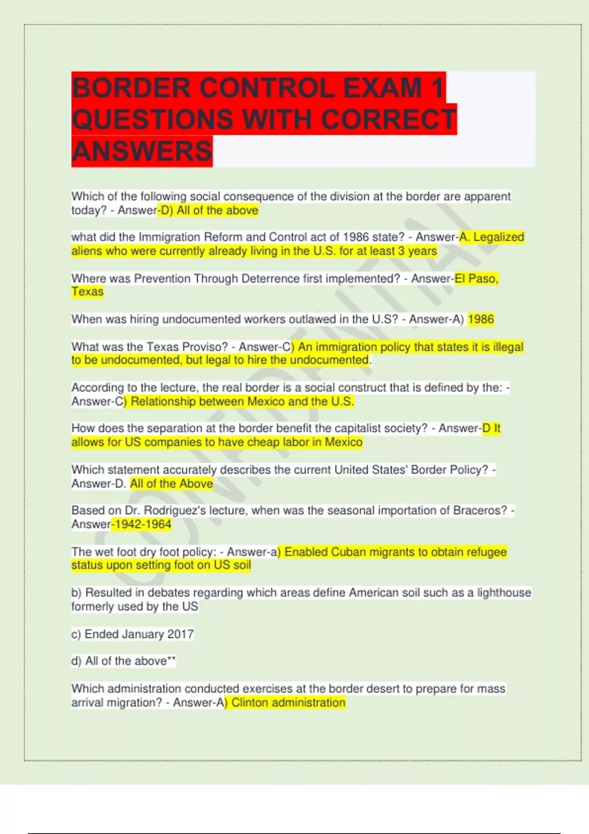 BORDER CONTROL EXAM 1 QUESTIONS WITH CORRECT ANSWERS Which of the following social consequence of the division at the border are apparent today? - Answer-D) All of the above what did the Immigration Reform and Control act of 1986 state? - Answer-A. Legalized aliens who were currently already living in the U.S. for at least 3 years Where was Prevention Through Deterrence first implemented? - Answer-El Paso, Texas When was hiring undocumented workers outlawed in the U.S? - Answer-A) 1986 What was the Texas Proviso? - Answer-C) An immigration policy that states it is illegal to be undocumented, but legal to hire the undocumented. According to the lecture, the real border is a social construct that is defined by the: - Answer-C) Relationship between Mexico and the U.S. How does the separation at the border benefit the capitalist society? - Answer-D It allows for US companies to have cheap labor in Mexico Which statement accurately describes the current United States' Border Policy? - Answer-D. All of the Above Based on Dr. Rodriguez's lecture, when was the seasonal importation of Braceros? - Answer- The wet foot dry foot policy: - Answer-a) Enabled Cuban migrants to obtain refugee status upon setting foot on US soil b) Resulted in debates regarding which areas define American soil such as a lighthouse formerly used by the US c) Ended January 2017 d) All of the above** Which administration conducted exercises at the border desert to prepare for mass arrival migration? - Answer-A) Clinton administration