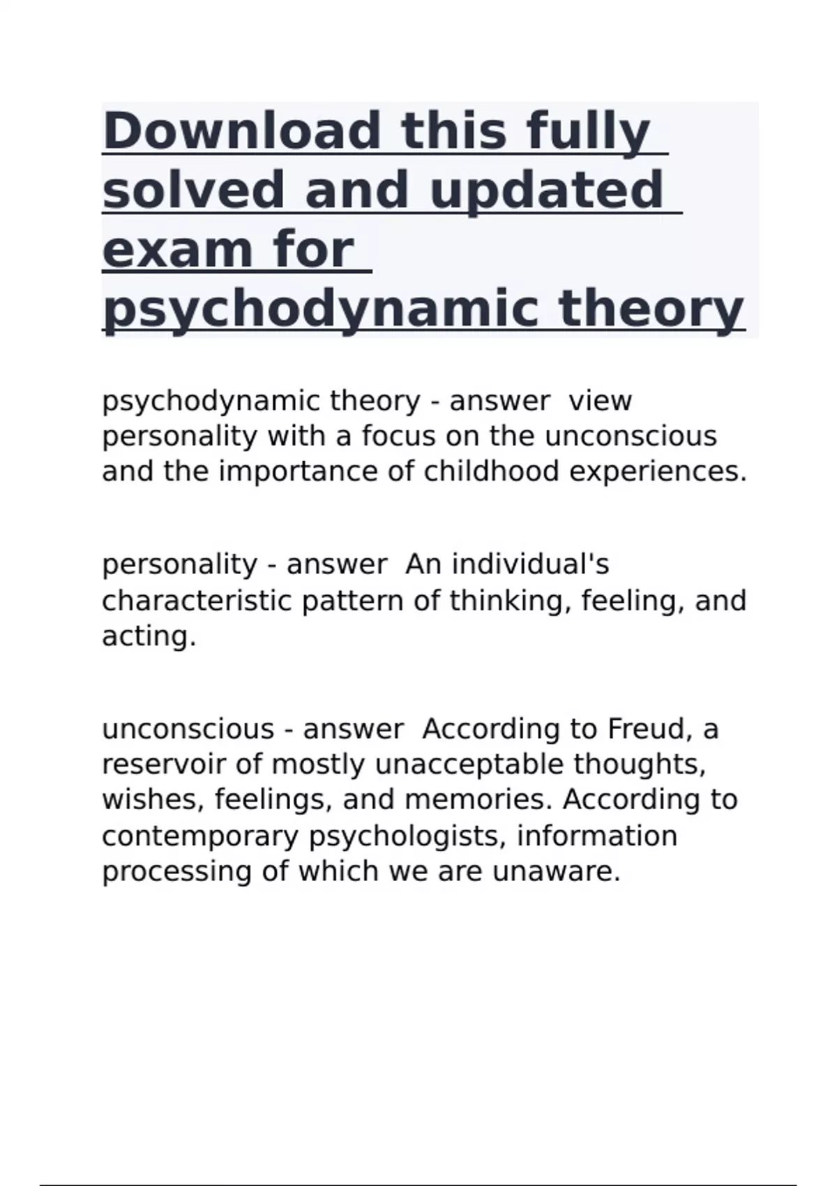Download this fully solved and updated exam for psychodynamic theory