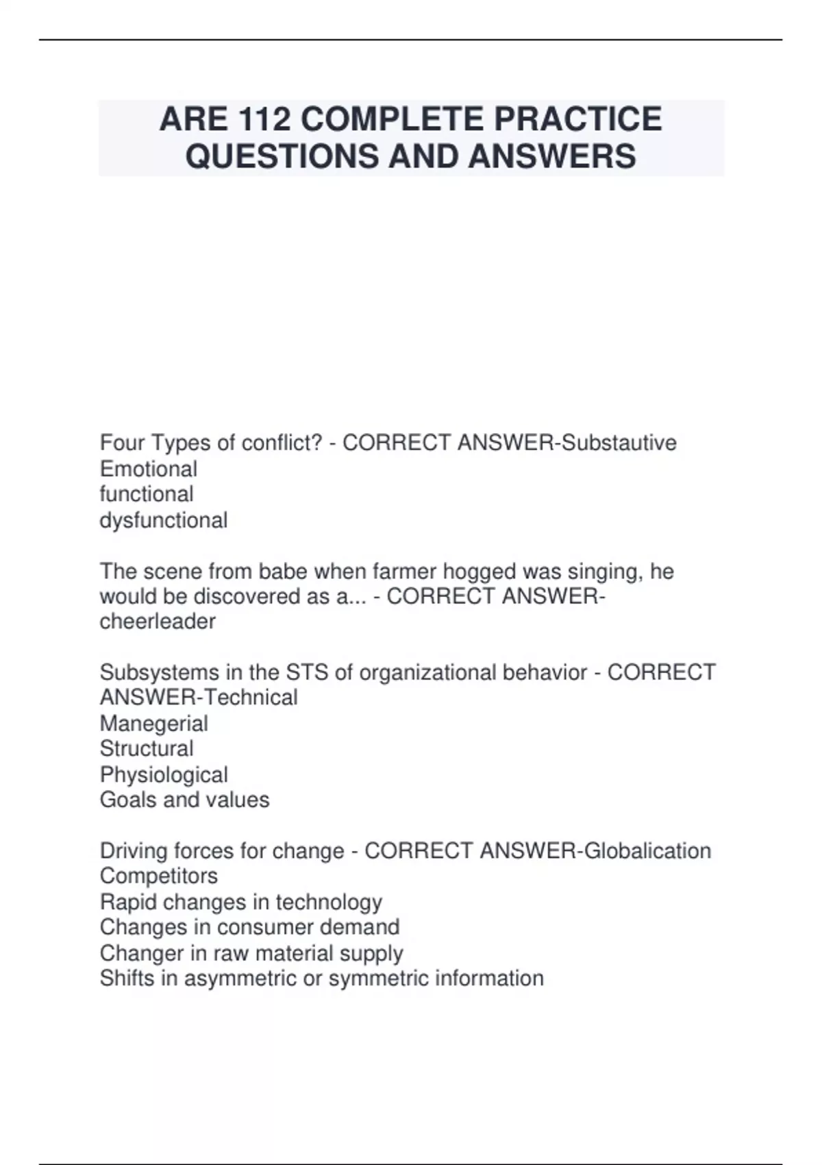 ARE 112 COMPLETE PRACTICE QUESTIONS AND ANSWERS Four Types of conflict? - CORRECT ANSWER-Substautive Emotional functional dysfunctional The scene from babe when farmer hogged was singing, he would be discovered as a... - CORRECT ANSWER cheerleader Subsystems in the STS of organizational behavior - CORRECT ANSWER-Technical Manegerial Structural Physiological Goals and values Driving forces for change - CORRECT ANSWER-Globalication Competitors Rapid changes in technology Changes in consumer demand Changer in raw material supply Shifts in asymmetric or symmetric information Showed importance of the behavioral aspects int he organization...... ex)recognition of the