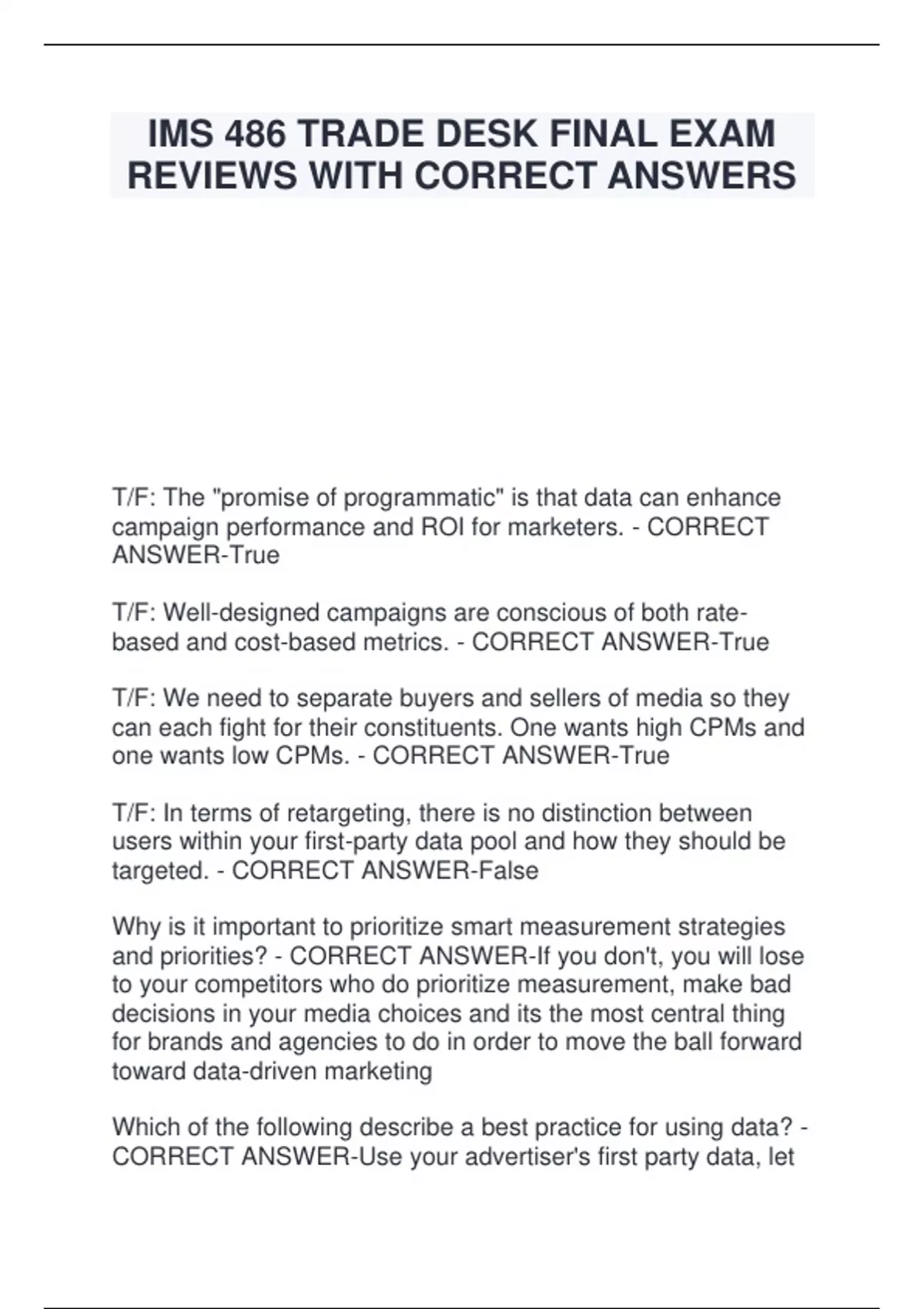 IMS 486 TRADE DESK FINAL EXAM REVIEWS WITH CORRECT ANSWERS T/F: The "promise of programmatic" is that data can enhance campaign performance and ROI for marketers. - CORRECT ANSWER-True T/F: Well-designed campaigns are conscious of both rate based and cost-based metrics. - CORRECT ANSWER-True T/F: We need to separate buyers and sellers of media so they can each fight for their constituents. One wants high CPMs and one wants low CPMs. - CORRECT ANSWER-True T/F: In terms of retargeting, there is no distinction between users within your first-party data pool and how they should be targeted. - CORRECT ANSWER-False Why is it important to prioritize smart measurement strategies and priorities? - CORRECT ANSWER-If you don't, you will lose to your competitors who do prioritize measurement, make bad decisions in your media choices and its the most central thing for brands and agencies to do in order to move the ball forward toward data-driven marketing Which of the following describe a best practice for using data? - CORRECT ANSWER-Use your