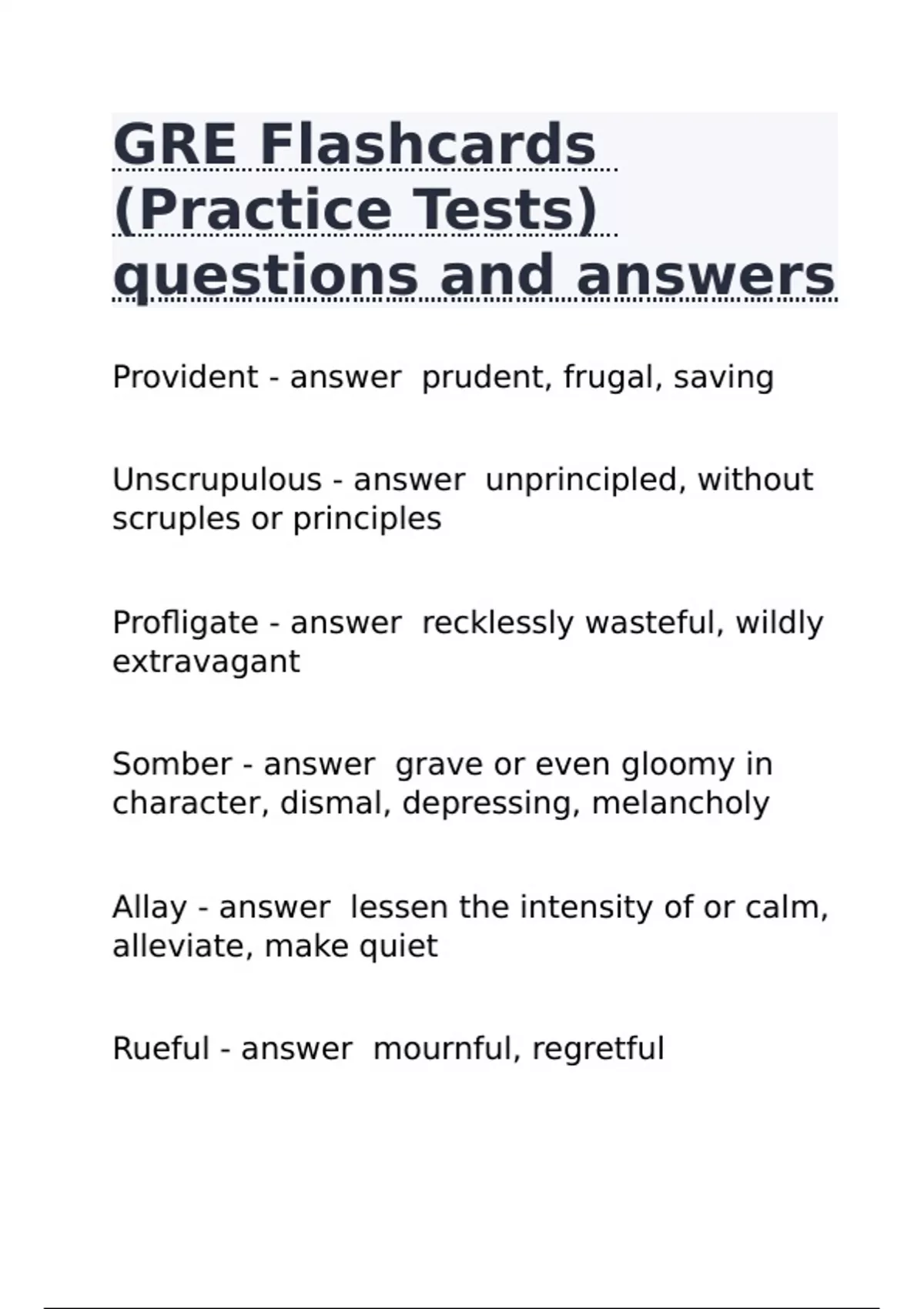 Provident prudent, frugal, saving Unscrupulous unprincipled, without scruples or principles Profligate recklessly wasteful, wildly extravagant Somber grave or even gloomy in character, dismal, depressing, melancholy Allay lessen the intensity of or calm, alleviate, make quiet Rueful mournful, regretful Impenitent not penitent or remorseful Sublime inspiring awe, to elevate or exalt, indignify Austere stern and cold in appearance, strict, ASCETIC Gadfly person who stimulates or annoys by persistent criticism Insipid lacking interest or significance, dull, flat, BANAL Expiation the act of atoning for sin or wrongdoing (especially appeasing a deity) Repose Verb: lean in a comfortable resting position, Noun: lay to rest Demur take exception to, to object Schism division of a group into opposing factions, discord, separation Boon a desirable state or a blessing, benefit, something very helpful Imbroglio intricate, complicated situation Acrimonious marked by strong resentment or cynicism, bitter, biting in feeling Panache dash or flamboyance in style Nepotism favoritism based on kinship Recidivism tendency to relapse into a behavior Cronyism favoritism shown to friends and associates (as by appointing them to positions without regard for their qualifications) Dogmatism giving opinion without evidence, a viewpoint or system of ideas based on insufficient examined premises Eschew avoid and stay away from deliberately Mollify make less rigid or softer; to reduce in intensity or rigidity, appease, soften Masticate chew (food); to soften or reduce to pulp by crushing Anecdote short account of an incident (especially a biographical one) Harangue a loud bombastic declamation expressed with strong emotion; ranting speech Volition act of making a decision, the capability of conscious choice and decision and intention Aggregate taking all units as a whole Iconoclast a person who destroys religious images, one who opposes established beliefs, customs, and institutions Taciturnity the trait of being uncommunicative Garrulity the quality of being wordy and talkative Loquacity the quality of being wordy and talkative Indolent Lazy, idle, disinclined to work or exertion Tractable easily managed (controlled or taught or molded) Banality commonplace; trite or overused expression; something that is obvious, or predictable; lacks freshness Precipitate verb: bring about abruptly; Adj: done with very great haste and without due deliberation List the property possessed by a line or surface that departs from the vertical Imprecise nice Aberrant one whose behavior departs substantially from the norm of a group; deviate Neologism a newly invented word or phrase; new sort of word or speech Dichotomy Divide into two parts, being twofold Chary characterized by great cautious and wariness; hesitant or reluctant Redoubtable inspiring fear