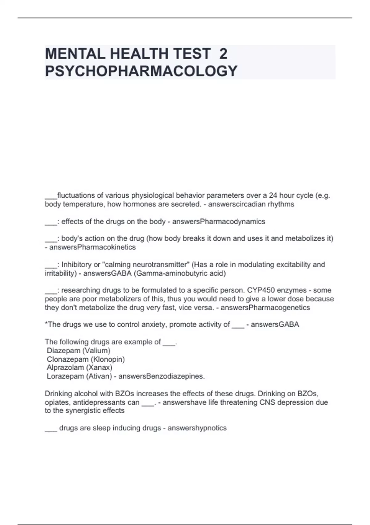 MENTAL HEALTH TEST -2 PSYCHOPHARMACOLOGY questions and answers Graded A+