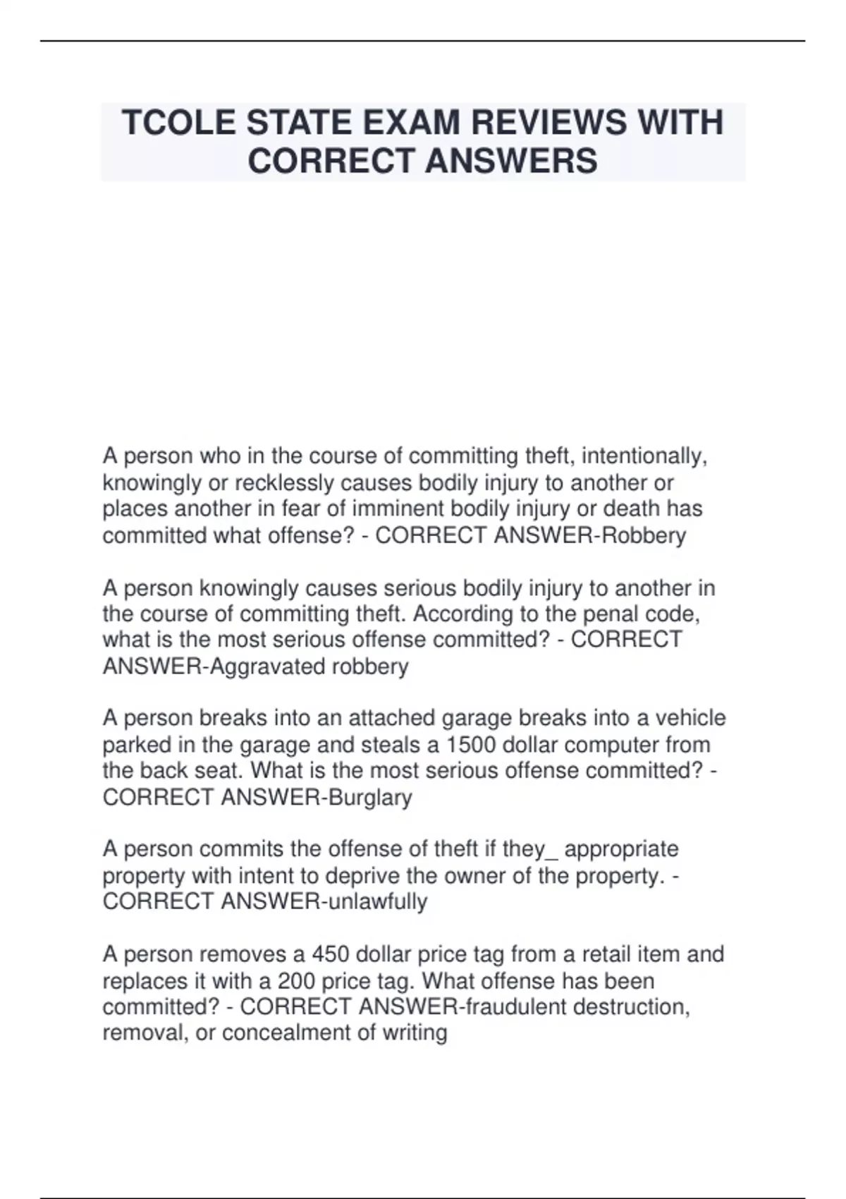 TCOLE STATE EXAM REVIEWS WITH CORRECT ANSWERS A person who in the course of committing theft, intentionally, knowingly or recklessly causes bodily injury to another or places another in fear of imminent bodily injury or death has committed what offense? - CORRECT ANSWER-Robbery A person knowingly causes serious bodily injury to another in the course of committing theft. According to the penal code, what is the most serious offense committed? - CORRECT ANSWER-Aggravated robbery A person breaks into an attached garage breaks into a vehicle parked in the garage and steals a 1500 dollar computer from the back seat. What is the most serious offense committed? - CORRECT ANSWER-Burglary A person commits the offense of theft if they_ appropriate property with intent to deprive the owner of the property. - CORRECT ANSWER-unlawfully A person removes a 450 dollar price tag from a retail item and replaces it with a 200 price tag. What offense has been committed? - CORRECT ANSWER-fraudulent destruction, removal, or concealment of writin