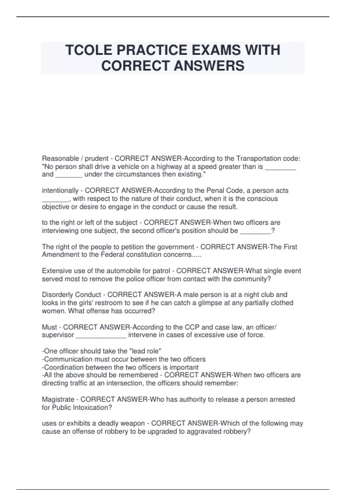 TCOLE PRACTICE EXAMS WITH CORRECT ANSWERS Reasonable / prudent - CORRECT ANSWER-According to the Transportation code: "No person shall drive a vehicle on a highway at a speed greater than is ________ and _______ under the circumstances then existing." intentionally - CORRECT ANSWER-According to the Penal Code, a person acts _______, with respect to the nature of their conduct, when it is the conscious objective or desire to engage in the conduct or cause the result. to the right or left of the subject - CORRECT ANSWER-When two officers are interviewing one subject, the second officer's position should be ________? The right of the people to petition the government - CORRECT ANSWER-The First Amendment to the Federal constitution concerns..... Extensive use of the automobile for patrol - CORRECT ANSWER-What single event served most to remove the police officer from contact with the community? Disorderly Conduct - CORRECT ANSWER-A male person is at a night club and looks in the girls' restroom to see if he can catch a glimpse at any partially clothed women. What offense has occurred? Must - CORRECT ANSWER-According to the CCP and case law, an officer/ supervisor _____________ intervene in cases of excessive use of force. -One officer should take the "lead role" -Communication must occur between the two officers -Coordination between the two officers is important -All the above should be remembered - CORRECT ANSWER-When two officers are directing traffic at an intersection, the officers should remember: Magistrate - CORRECT ANSWER-Who has authority to release a person arrested for Public Intoxication? uses or exhibits a deadly weapon - CORRECT ANSWER-Which of the following may cause an offense of robbery to be upgraded to aggravated robbery? care for injured - CORRECT ANSWER-What is the first thing an officer does during the "Scene Management" stage? Roadway - CORRECT ANSWER-The ________ is that portion of a highway improved, designed or ordinarily used for vehicular travel, exclusive of the berm or shoulder. Justice is to be served - CORRECT ANSWER-Time must be devoted to exploring motives, possible omissions, and assessing the truth if ________________________. The right of an accused to counsel for his defense - CORRECT ANSWER-The Sixth Amendment to the Federal Constitution includes..... 18 - CORRECT ANSWER-According to the Transportation Code, it is unlawful to operate an open bed pickup truck with a child younger than _____ in the open bed. codifies certain illegal behaviors of public officials - CORRECT ANSWER-Title 8 of the Texas Penal Code (chapters 36, 37 and 38): Excessive Bail - CORRECT ANSWER-The Sixth Amendment covers all of the following except: hallucinogens - CORRECT ANSWER-The major classifications of drugs include narcotics, depressants, stimulants and ______. Culture - CORRECT ANSWER-A way of thinking and acting based on tradition or learned behavior passed down from one generation to the next describes..... an attachment - CORRECT ANSWER-The writ that is issued under seal, commanding a peace officer to deliver the body of a witness before a grand jury proceeding is called: limited to situations where the officer or an innocent thrid party is physically threatened a matter of departmental policy and authorized only with specific supervisory permission in each case - CORRECT ANSWER-Shooting at nonviolent fleeing felons is Racial - CORRECT ANSWER-What is the most common form of prejudice? Right to a Grand Jury - CORRECT ANSWER-The Fifth Amendment addresses which of the following: Usable - CORRECT ANSWER-According to the HSC 481.121, possession of Marihuana: A person commits an offense if the person intentionally or knowingly possesses a ____________ quantity of marihuana. False - CORRECT ANSWER-Delinquent Conduct is conduct, including traffic offenses, that violates the Penal Laws of this State. expire - CORRECT ANSWER-According to Commission Rules, the license of any licensee who does not meet the legislatively required continuing education by the expiration date will _______. 3rd degree felony - CORRECT ANSWER-A person found in posses