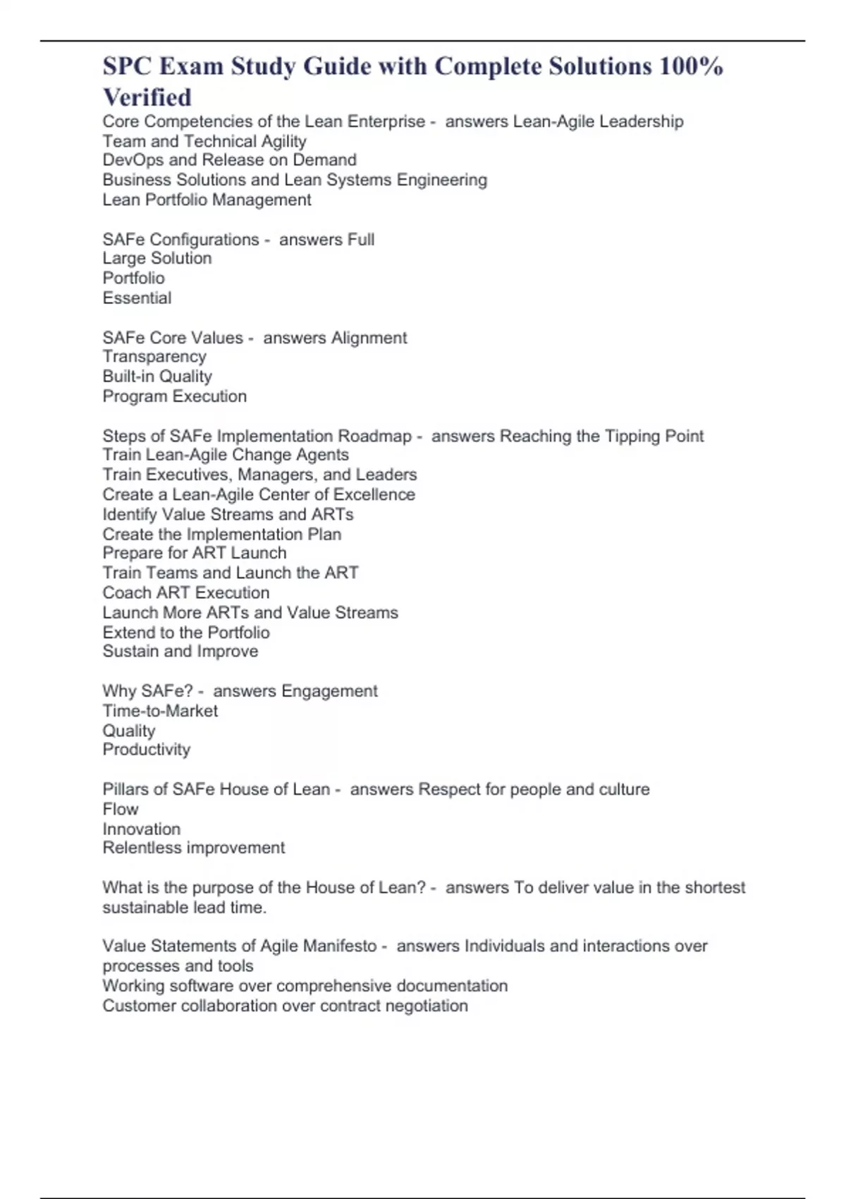 SPC Exam Study Guide with Complete Solutions 100% Verified Core Competencies of the Lean Enterprise - Correct Answer Lean-Agile Leadership Team and Technical Agility DevOps and Release on Demand Business Solutions and Lean Systems Engineering Lean Portfolio Management SAFe Configurations - Correct Answer Full Large Solution Portfolio Essential SAFe Core Values - Correct Answer Alignment Transparency Built-in Quality Program Execution Steps of SAFe Implementation Roadmap - Correct Answer Reaching the Tipping Point Train Lean-Agile Change Agents Train Executives, Managers, and Leaders Create a Lean-Agile Center of Excellence Identify Value Streams and ARTs Create the Implementation Plan Prepare for ART Launch Train Teams and Launch the ART Coach ART Execution Launch More ARTs and Value Streams Extend to the Portfolio Sustain and Improve Why SAFe? - Correct Answer Engagement Time-to-Market Quality Productivity Pillars of SAFe House of Lean - Correct Answer Respect for people and culture Flow Innovation