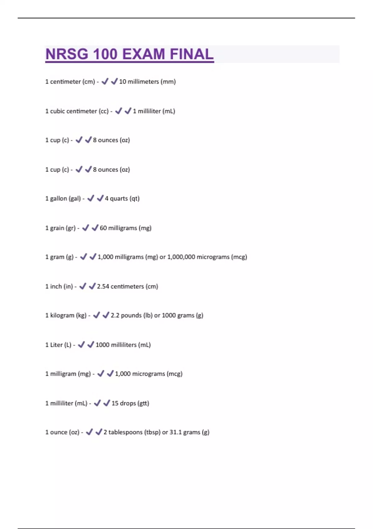 1 centimeter (cm) - 10 millimeters (mm) 1 cubic centimeter (cc) - 1 milliliter (mL) 1 cup (c) - 8 ounces (oz) 1 cup (c) - 8 ounces (oz) 1 gallon (gal) - 4 quarts (qt) 1 grain (gr) - 60 milligrams (mg) 1 gram (g) - 1,000 milligrams (mg) or 1,000,000 micrograms (mcg) 1 inch (in) - 2.54 centimeters (cm) 1 kilogram (kg) - 2.2 pounds (lb) or 1000 grams (g) 1 Liter (L) - 1000 milliliters (mL) 1 milligram (mg) - 1,000 micrograms (mcg) 1 milliliter (mL) - 15 drops (gtt) 1 ounce (oz) - 2 tablespoons (tbsp) or 31.1 grams (g)1 pint (pt) - 16 ounces (oz) 1 pound (lb) - 16 ounces (oz) 1 quart (qt) - .946 liters (L) 1 tablespoon (tbsp) - 15 milliliters (mL) 1 teacup - 6 ounces (oz) 1 teaspoon (tsp) - 5 milliliters (mL) or 75 drops (gtt) 3 teaspoons (tsp) - 1 tablespoon (tbsp) A pt recovering from stroke requested if she can eat by herself. The RN assisted the pt to make sure she eats it all. The RN violated all except: - a) Beneficence - To do good and promote good b) Autonomy -Person's right to choose c) Non - maleficence - Do no harm and to prevent harm d) Veracity - Duty to tell the truth