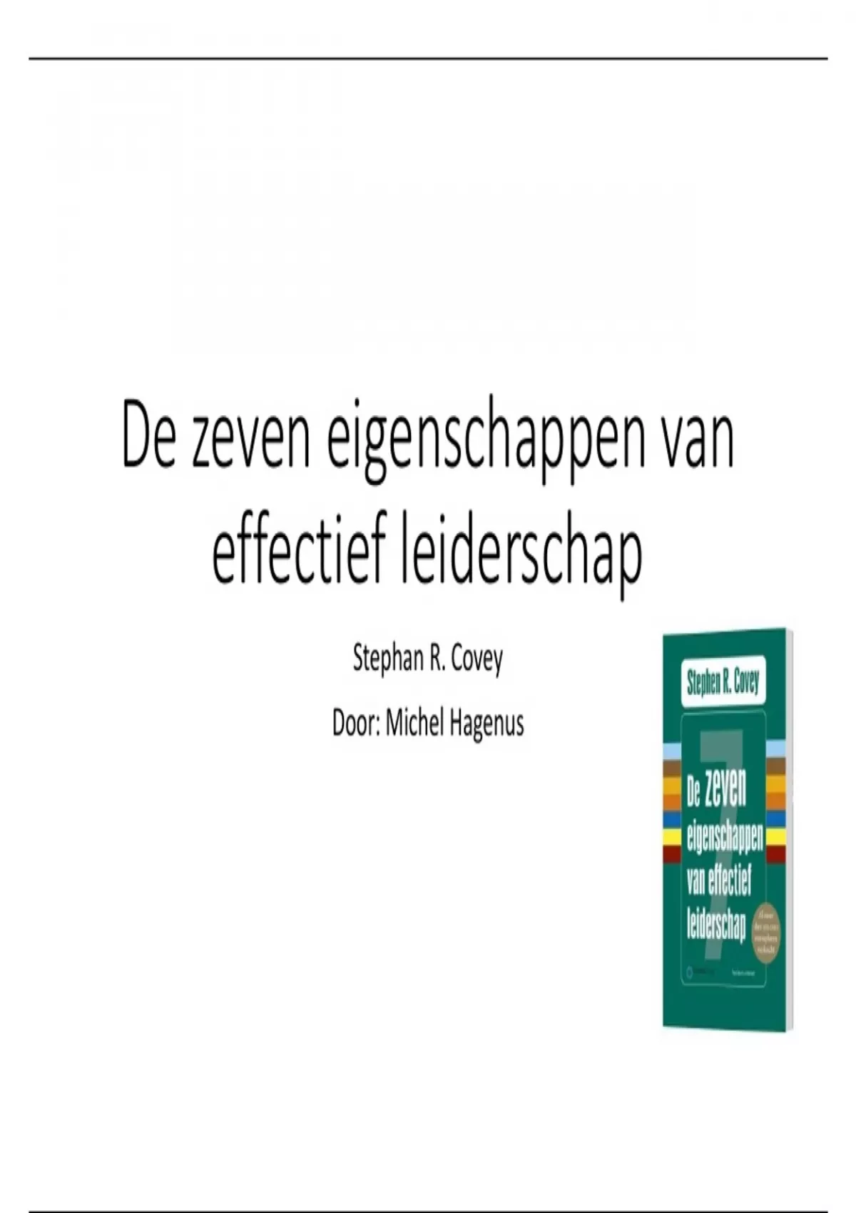 De zeven eigenschappen van effectief leiderschap van Stephen Covey helpt iedereen eigenschappen aan te leren om effectief te leven. De samenvaating is kort en bondig van aard om zoveel mogelijk focus op de 7 eigenschappen te houden. De samenvaating is illustratief van aard om op diverse manieren te gebruiken.