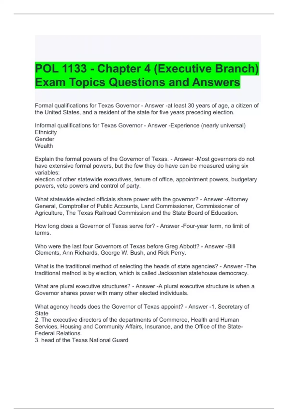 POL 1133 - Chapter 4 (Executive Branch) Exam Topics Questions and Answers