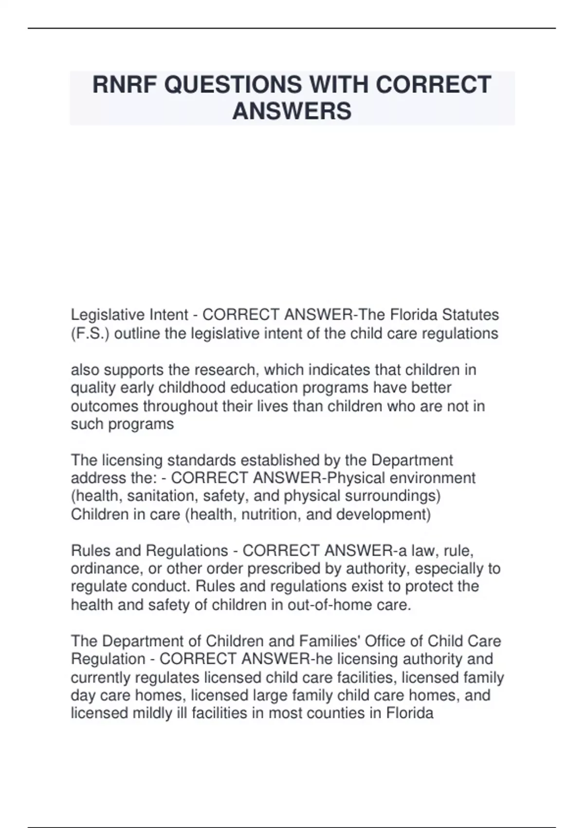 RNRF QUESTIONS WITH CORRECT ANSWERS Legislative Intent - CORRECT ANSWER-The Florida Statutes (F.S.) outline the legislative intent of the child care regulations also supports the research, which indicates that children in quality early childhood education programs have better outcomes throughout their lives than children who are not in such programs The licensing standards established by the Department address the: - CORRECT ANSWER-Physical environment (health, sanitation, safety, and physical surroundings) Children in care (health, nutrition, and development) Rules and Regulations - CORRECT ANSWER-a law, rule, ordinance, or other order prescribed by authority, especially to regulate conduct. Rules and regulations exist to protect the health and safety of children in out-of-home care. The Department of Children and Families' Office of Child Care Regulation - CORRECT ANSWER-he licensing authority and currently regulates licensed child care facilities, licensed family day care homes, licensed large family child care homes, and licensed mildly ill facilities in most counties in Florida Child care provided between the hours of 6 p.m. on Friday and 6 a.m. on Monday - CORRECT ANSWER-weekend child care Includes all owners, operators, employees, and volunteers working in a child care facility - CORRECT ANSWER-child care personnel Actively watching and directing children's activities within the same space, and responding to the needs of each child while in care - CORRECT ANSWER-direct supervision On-site administrator or individual who has the primary responsibility for the day-to-day operation, supervision, and administration of a child care facility - CORRECT ANSWER director Directly supervised volunteers who participate in the federal program pursuant to 45 Code of Federal Regu