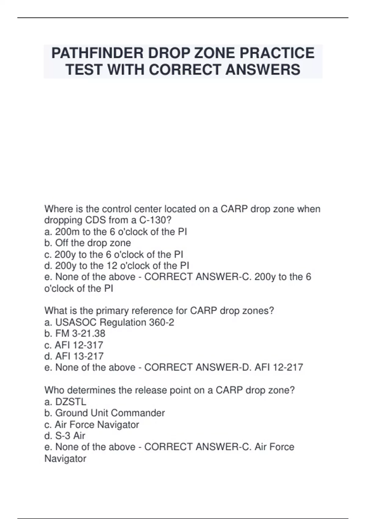 PATHFINDER DROP ZONE PRACTICE TEST WITH CORRECT ANSWERS Where is the control center located on a CARP drop zone when dropping CDS from a C-130? a. 200m to the 6 o'clock of the PI b. Off the drop zone c. 200y to the 6 o'clock of the PI d. 200y to the 12 o'clock of the PI e. None of the above - CORRECT ANSWER-C. 200y to the 6 o'clock of the PI What is the primary reference for CARP drop zones? a. USASOC Regulation 360-2 b. FM 3-21.38 c. AFI 12-317 d. AFI 13-217 e. None of the above - CORRECT ANSWER-D. AFI 12-217 Who determines the release point on a CARP drop zone? a. DZSTL b. Ground Unit Commander c. Air Force Navigator d. S-3 Air e. None of the above - CORRECT ANSWER-C. Air Force Navigator What is the minimum drop altitude in feet MSL for a C-130H, dropping door bundles using T-10 cargo parachutes at night if the highest point is 149 feet above s