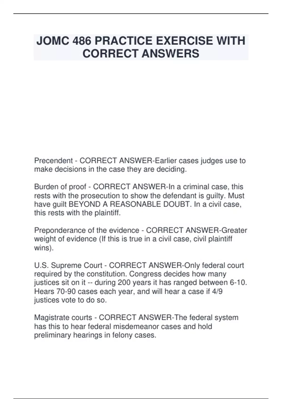 JOMC 486 PRACTICE EXERCISE WITH CORRECT ANSWERS Precendent - CORRECT ANSWER-Earlier cases judges use to make decisions in the case they are deciding. Burden of proof - CORRECT ANSWER-In a criminal case, this rests with the prosecution to show the defendant is guilty. Must have guilt BEYOND A REASONABLE DOUBT. In a civil case, this rests with the plaintiff. Preponderance of the evidence - CORRECT ANSWER-Greater weight of evidence (If this is true in a civil case, civil plaintiff wins). U.S. Supreme Court - CORRECT ANSWER-Only federal court required by the constitution. Congress decides how many justices sit on it -- during 200 years it has ranged between 6-10. Hears 70-90 cases each year, and will hear a case if 4/9 justices vote to do so. Magistrate courts - CORRECT ANSWER-The federal system has this to hear federal misdemeanor cases and hold preliminary hearings in felony cases