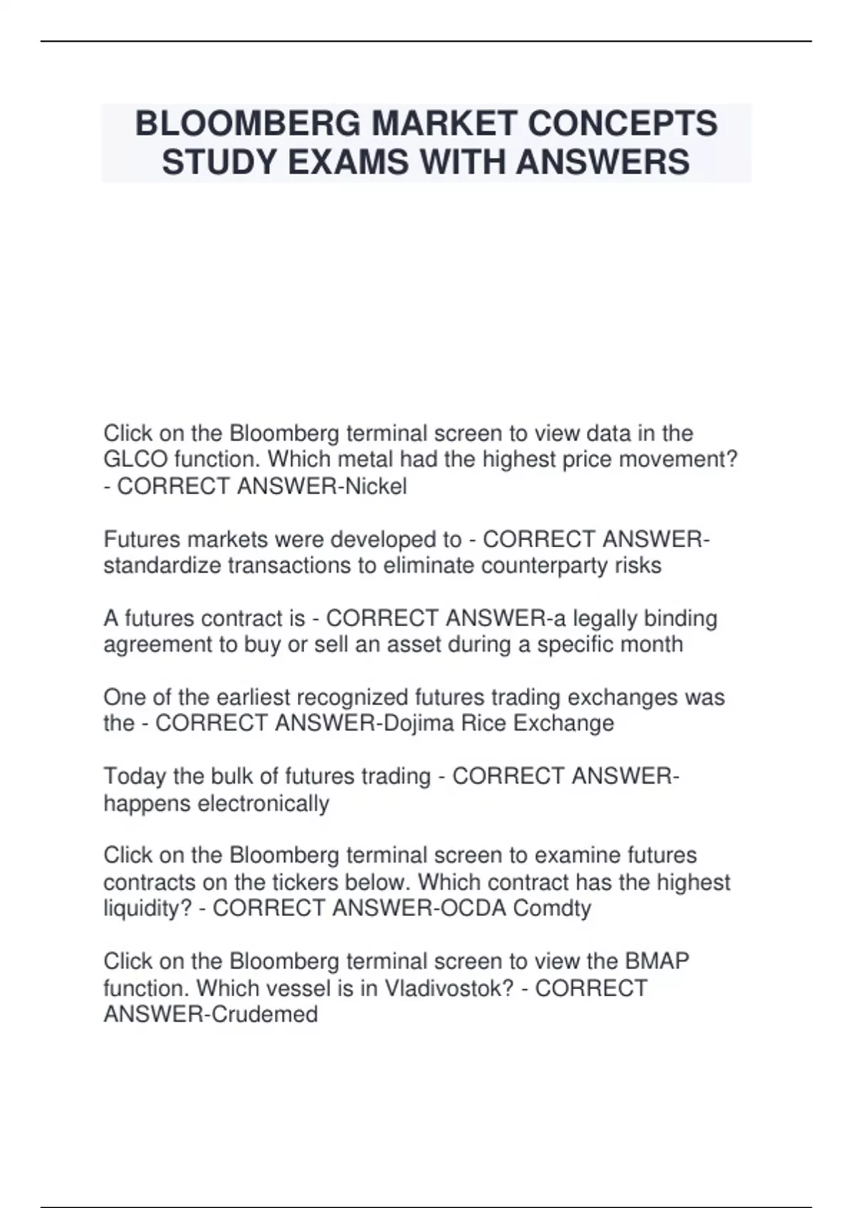 BLOOMBERG MARKET CONCEPTS STUDY EXAMS WITH ANSWERS Click on the Bloomberg terminal screen to view data in the GLCO function. Which metal had the highest price movement? - CORRECT ANSWER-Nickel Futures markets were developed to - CORRECT ANSWER standardize transactions to eliminate counterparty risks A futures contract is - CORRECT ANSWER-a legally binding agreement to buy or sell an asset during a specific month One of the earliest recognized futures trading exchanges was the - CORRECT ANSWER-Dojima Rice Exchange Today the bulk of futures trading - CORRECT ANSWER happens electronically Click on the Bloomberg terminal screen to examine futures contracts on the tickers below. Which contract has the highest liquidity? - CORRECT ANSWER-OCDA Comdty Click on the Bloomberg terminal screen to view the BMAP function. Which vessel is in Vladivostok? - CORRECT