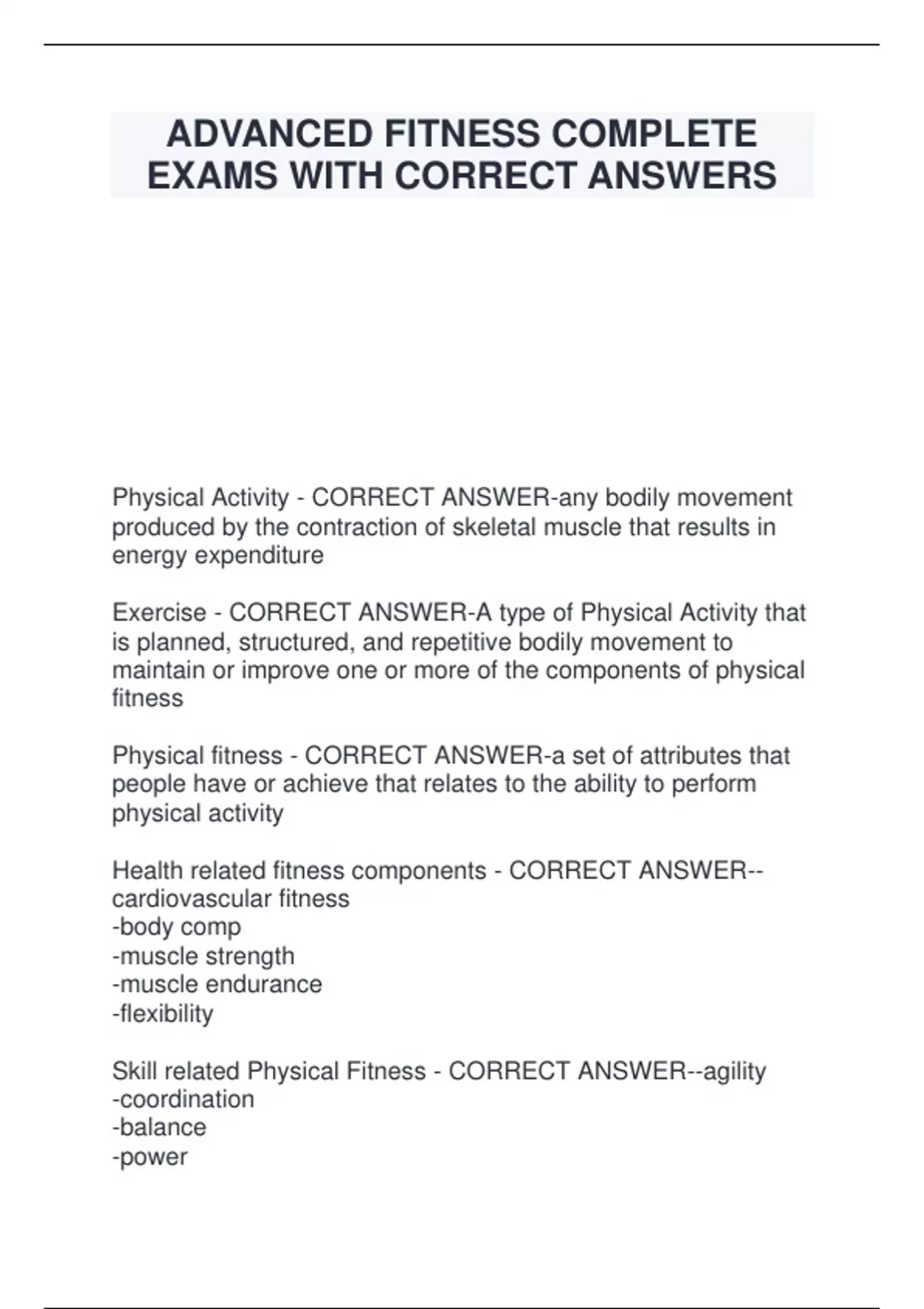 ADVANCED FITNESS COMPLETE EXAMS WITH CORRECT ANSWERS Physical Activity - CORRECT ANSWER-any bodily movement produced by the contraction of skeletal muscle that results in energy expenditure Exercise - CORRECT ANSWER-A type of Physical Activity that is planned, structured, and repetitive bodily movement to maintain or improve one or more of the components of physical fitness Physical fitness - CORRECT ANSWER-a set of attributes that people have or achieve that relates to the ability to perform physical activity Health related fitness components - CORRECT ANSWER- cardiovascular fitness -body comp -muscle strength -muscle endurance -flexibility Skill related Physical Fitness - CORRECT ANSWER--agility -coordination -balance -power -reaction time -speed Exercise log - CORRECT ANSWER-