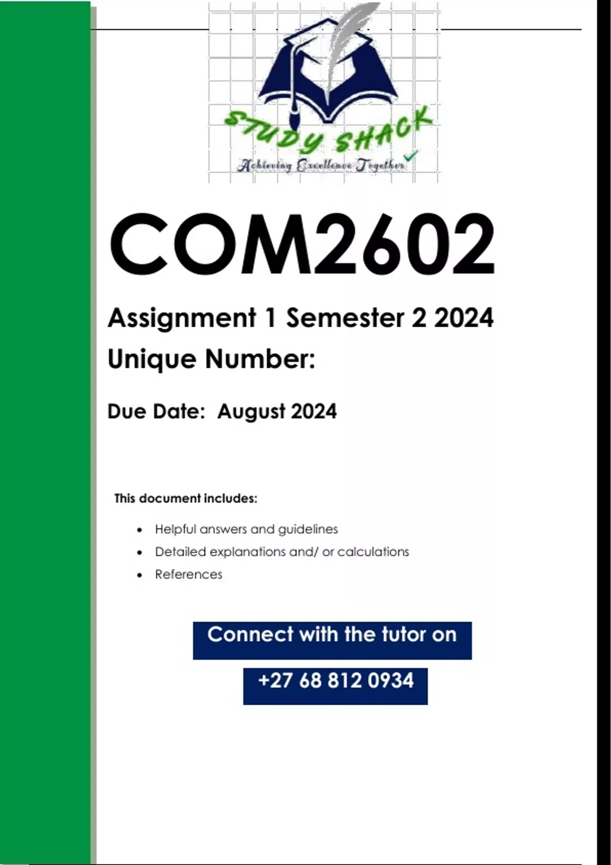 This document contains workings, explanations and solutions to the COM2602 Assignment 1 (QUALITY ANSWERS) Semester 2 2024. For assistance whats-app us on 0.6.8..8.1.2..0.9.3.4....QQUESTION 1 COMMUNICATION IN THE ORGANISATION 1.1 There is a debate between communicators in the field of organisational communication regarding the role of communication. Some commentators view communication as a tactical activity in the organisation, manifested in such practices as public relations or advertising. On the other hand, other communicators argue that, in fact, communication has a strategic role in the organisation. Taking this scenario into consideration: 1.1.1 Discuss the concept of strategy and its extensions. (15) 1.1.2 Explain whether communication has a strategic role or not. (10) [25] 16 QUESTION 2 THE RATIONALE FOR INTEGRATING ORGANISATIONS’ COMMUNICATION 2.1 According to Angelopulo and Barker (2013: 41) communication integration “has its origins in marketing communication and has expanded to include a full range of organisational communication fields”. In an effort to ensure maximum communication impact and message consistency, organisations across all sectors of the economy, are beginning to embrace communication integration. You are the head of marketing and communication at a multi-campus college for further education and training. The college’s communication campaigns have been characterised by message inconsistencies and lack of synergy. This is because the college has managed its communication efforts in an uncoordinated way, leaving it to individual managers to decide on how to communicate. To make matters worse, the top management of the college does not understand the concept “communication integration”, with special reference to its definition, historical development and alignment of messages from various sources. As the head of marketing and communication at the college, you should do the following: 2.1.1 Define communication integration. (5) 2.1.2 Trace the historical development of communication integration. (15) 2.1.3 Discuss the alignment of messages from all sources. (10) [30] QUESTION 3 COMMUNICATION INTEGRATION PROCESSES Continuing from the scenario in Question 2: 3.1 As the head of marketing and communication, you have noticed that the college’s communication campaigns have been characterised by message inconsistencies and a lack of synergy, and also that the communication efforts of the college have been managed in an uncoordinated way. To help the communication managers understand the negative impact of the college’s communication efforts, explain the operational process drivers for making integration a strategic imperative, as suggested by Duncan and Moriarty (1997). (12) 3.2 Discuss, with examples based on the scenario, these pitfalls that can limit the success of an organisation’s communication and its integration: 3.2.1 The impact of unplanned communication. (7) 3.2.2 The time perspective of various types of communication. (8) [25] COM2602/101/3/2024 17 QUESTION 4: INTEGRATED COMMUNICATION MEASUREMENT 4.1 Although it is true that there is a distinction to be made between the output and the outcomes of integration, this is in contrast to the view of Duncan and Moriarty (1997a), who believe that output refers to the results or effects of integrated marketing. With this statement as reference, and in not more than 100 words, differentiate between output of integrated communication and outcomes or effects of integration.