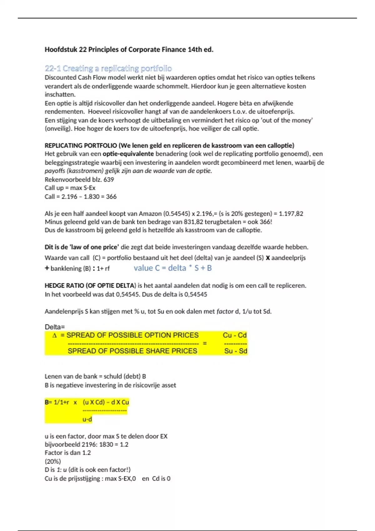 Waarde van call (C) = portfolio bestaand uit het deel (delta) van je aandeel (S) x aandeelprijs