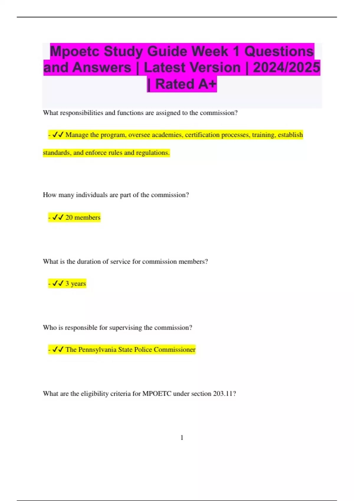 Mpoetc Study Guide Week 1 Questions and Answers | Latest Version | 2024/2025 | Rated A+ What responsibilities and functions are assigned to the commission? - Manage the program, oversee academies, certification processes, training, establish standards, and enforce rules and regulations. How many individuals are part of the commission? - 20 members What is the duration of service for commission members? - 3 years Who is responsible for supervising the commission? - The Pennsylvania State Police Commissioner What are the eligibility criteria for MPOETC under section 203.11? 2 - Must be at least 18 years old, hold a high school diploma, be a U.S. citizen, have no disqualifying criminal convictions, pass a physical exam, be free from drug and alcohol use, and succeed in psychological, hearing, and vision tests. How long is a certification valid for? - 2 years What conditions can lead to the revocation of certification? - Being convicted of a crime, failing to perform duties, not maintaining certification requirements, cheating, or having significant physical or psychological issues. What are the mandatory in-service training requirements? - Annual firearms training, first aid and CPR, and yearly academy training as mandated by MPOETC. How many hours of training does MPOETC mandate each year for in-service officers? - 12 hours What are the different systems utilized in law enforcement? 3 - Value system, moral system, and belief system What components are encompassed in police work? - The Pennsylvania Crimes Code Title 18, Pennsylvania Criminal Rules, statutory laws of the Commonwealth, case law, and authority as defined in the Municipal Police Jurisdiction Act. What role do police officers play