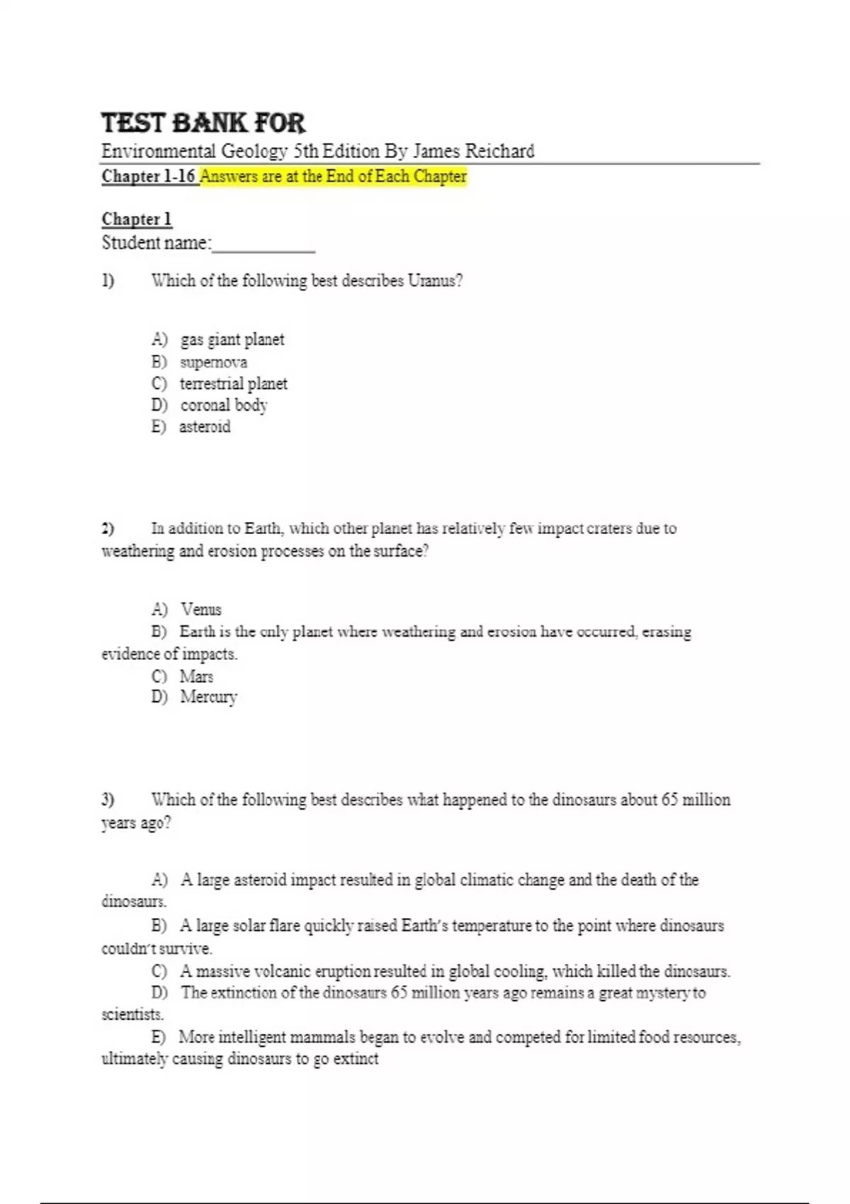 Test Bank For Environmental Geology 5th Edition By James Reichard Chapter 1-16