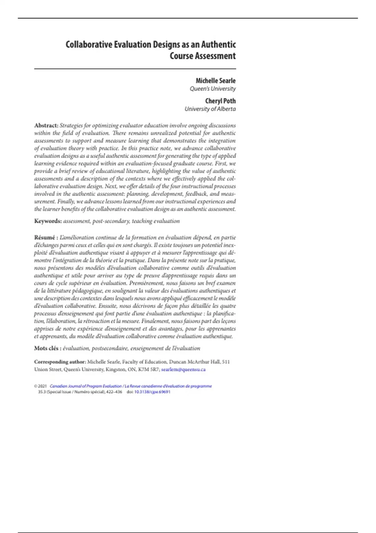 Collaborative Evaluation Designs as an Authentic Course Assessment Michelle Searle Queen’s University Cheryl Poth University of Alberta Abstract: Strategies for optimizing evaluator education involve ongoing discussions within the field of evaluation. There remains unrealized potential for authentic assessments to support and measure learning that demonstrates the integration of evaluation theory with practice. In this practice note, we advance collaborative evaluation designs as a useful authentic assessment for generating the type of applied learning evidence required within an evaluationfocused graduate course. First, we provide a brief review of educational literature, highlighting the value of authentic assessments and a description of the contexts where we effectively applied the collaborative evaluation design. Next, we offer details of the four instructional processes involved in the authentic assessment: planning, development, feedback, and measurement. Finally, we advance lessons learned from our instructional experiences and the learner benefits of the collaborative evaluation design as an authentic assessment. Keywords: assessment, postsecondary, teaching evaluation Résumé : L’amélioration continue de la formation en évaluation dépend, en partie d’échanges parmi ceux et celles qui en sont chargés. Il existe toujours un potentiel inexploité d’évaluation authentique visant à appuyer et à mesurer l’apprentissage qui démontre l’intégration de la théorie et la pratique. Dans la présente note sur la pratique, nous présentons des modèles d’évaluation collaborative comme outils d’évaluation authentique et utile pour arriver au type de preuve d’apprentissage requis dans un cours de cycle supérieur en évaluation. Premièrement, nous faisons un bref examen de la littérature pédagogique, en soulignant la valeur des évaluations authentiques et une description des contextes dans lesquels nous avons appliqué effi cacement le modèle d’évaluation collaborative. Ensuite, nous décrivons de façon plus détaillée les quatre processus d’enseignement qui font partie d’une évaluation authentique : la planifi cation, l’élaboration, la rétroaction et la mesure. Finalement, nous faisons part des leçons apprises de notre expérience d’enseignement et des avantages, pour les apprenantes et apprenants, du modèle d’évaluation collaborative comme évaluation authentique. Mots clés : évaluation, postsecondaire, enseignement de l’évaluation Corresponding author: Michelle Searle, Faculty of Education, Duncan McArthur Hall, 511 Union Street, Queen’s University, Kingston, ON, K7M 5R7; © 2021 Canadian Journal of Program Evaluation / La Revue canadienne d’évaluation de programme 35.3 (Special Issue / Numéro spécial), 422–436 doi: 10.3138/cjpe.69691 Collaborative Evaluation Designs as Course Assessment 423 Strategies for optimizing evaluator education involve ongoing discussions within the fi eld of evaluation (e.g., Chouinard et al., 2017; Gullickson et al., 2019; Poth et al., 2020; Trevisan, 2004). Postsecondary contexts are well known for their use of assessment strategies such as tests, quizzes, and essays to measure learning at the end of a course. While these strategies may be well suited for measuring learners’ acquired knowledge of specific evaluation concepts, they may be insuffi cient for generating reliable and valid evidence of applications of complex evaluation skills in practice. The need for this type of learning experience is well established in the field; Gredler and Johnson (2001 ), for example, reflected on the value of directed evaluation experience as an adjunct to coursebased work, citing the knowledge broadened by encountering realworld issues and the validation of emerging professional identities. Indeed, learners and instructors of evaluationfocused courses may well be better served by assessments that measure learning outcomes focused on the practical application of knowledge and skills (Knight, 2012). Yet there remains unrealized potential for authentic assessments within evaluationfocused coursework, evaluations that support and measure learning that demonstrates the integration of evaluation theory with practice. As evaluation educators who have extensive training and experiences as instructors within K12 and postsecondary education systems and who are wellestablished assessment scholars, we are well positioned for advancing the use of authentic assessments. We draw from our knowledge and research products highlighting the benefits of authentic assessment for both learners and instructors to bring the usefulness of authentic assessment into the dialogue of evaluator education. As one of the challenges of doing so is using fi eldspecifi c terminology, and because prominent evaluators remind us that language matters (e.g. Hopson, 2000; Patton, 2000), we pause for a moment to clarify a key term. While the word authentic is oft en used within educational literature to describe tasks, rubrics, and assessments that focus on realworld practice (Gulikers et al., 2008), we use the term authentic assessments to distinguish the generation of learning evidence within the integration of evaluation theory with practice. Th is usage aligns with that of Wiggins (1998 ) as a way to identify assessments when the learner is asked to complete a task that is highly similar to what they would encounter in their future professional practice. Authentic assessments within evaluator education place an emphasis on the learning processes that occur within realworld contexts and direct attention to the need for, and ways of, integrating feedback and reflection to extend learning. We advance authentic assessment as a term to be leveraged by evaluator educators to describe the processes involved in supporting and measuring desirable applied learning evidence that is specifi c to evaluation. In this practice note, we advance collaborati