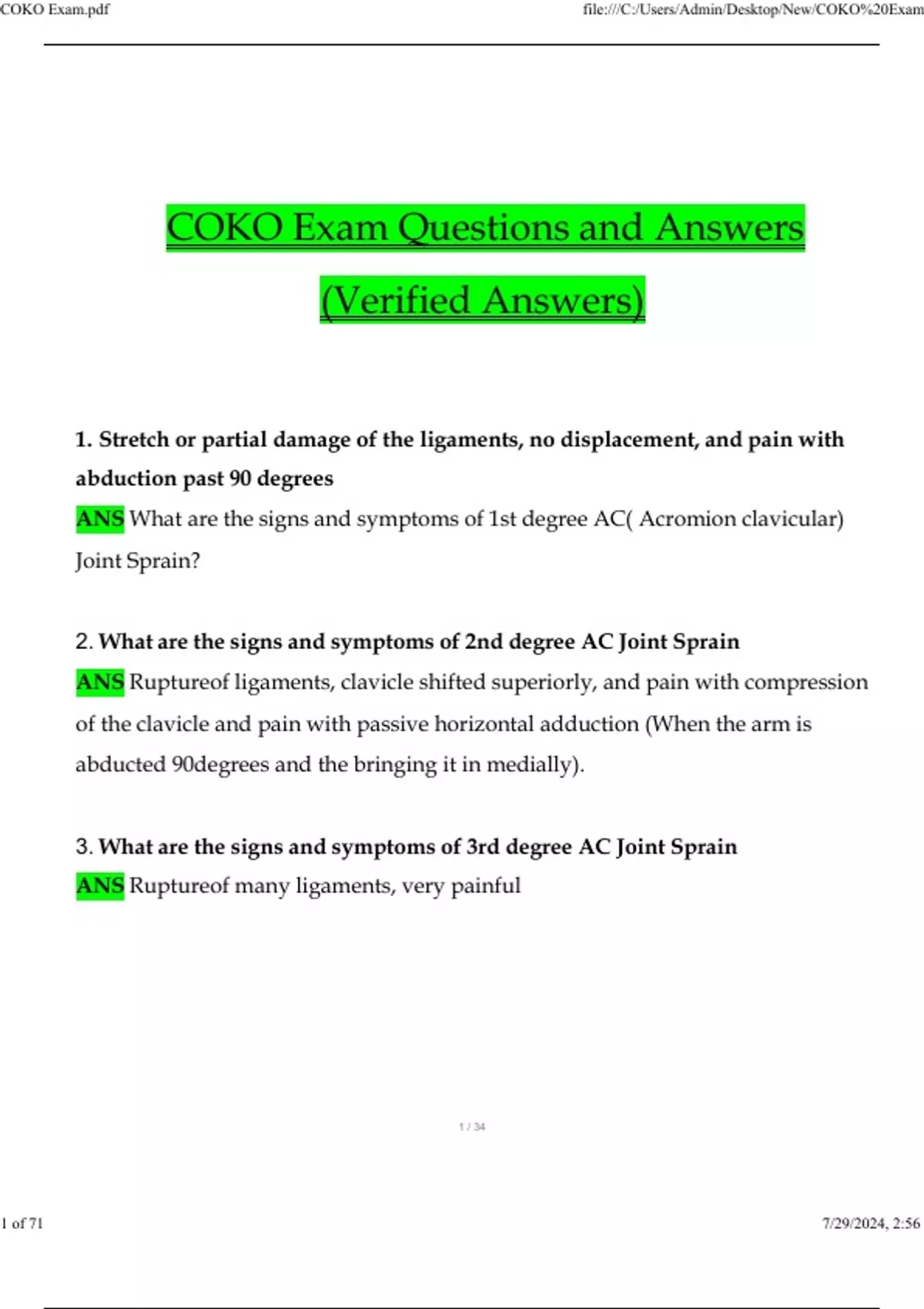 COKO Exam (2024/2025) Questions and Answers (Verified Answers) COKO Exam (2024/2025) Questions and Answers (Verified Answers) COKO Exam (2024/2025) Questions and Answers (Verified Answers) COKO Exam (2024/2025) Questions and Answers (Verified Answers) 1 / 34 COKO Exam Questions and Answers (Verified Answers) 1. Stretch or partial damage of the ligaments, no displacement, and pain with abduction past 90 degrees ANS What are the signs and symptoms of 1st degree AC( Acromion clavicular) Joint Sprain? 2. What are the signs and symptoms of 2nd degree AC Joint Sprain ANS Ruptureof ligaments, clavicle shifted superiorly, and pain with compression of the clavicle and pain with passive horizontal adduction (When the arm is abducted 90degrees and the bringing it in medially). 3. What are the signs and symptoms of 3rd degree AC Joint Sprain ANS Ruptureof many ligaments, very painfulCOKO E file:///C:/Users/Admin/Desktop/New/COKO%20E 1 of 71 7/29/2024, 2:56 AM 2 / 34 eral Epi- nic injury that . 4. Explain the mechanisms of injury and signs/symptoms of Lat condylitis: Lateral Epicondylitis (also known as tennis elbow) is a chro occurs from overuse of forearm extensors (gripping). This is seen as repeated varus stress to the elbow joint. Symptoms: May be pain at the site and swelling and bruising. 5. Carpal Tunnel Syndrome: A condition caused by compression of the median nerve in the carpal tunnel and characterized especially by weakness, pain, and disturbances of sensation in the hand and fingers. Usually done by repetitive overuse or direct trauma.Symptoms: Pain at night, relief with shaking hand.Pain on the palmar side. Grip & Pinch limited May worsen when the wrist is fully extended of flexed with gripping. 6. What are the cardinal signs of inflammationCOKO E file:///C:/Users/Admin/Desktop/New/COKO%20E 2 of 71 7/29/2024, 2:56 AM 3 / 34 ANS Redness, Heat, Swelling, Pain,and Loss of Function 7. What sort of diet may aid in pain reduction ANS A ketogenic diet has anti-inflam-matory properties, thus decreases inflammation and reduces pain.COKO E file:///C:/Users/Admin/Desktop/New/COKO%20E 3 of 71 7/29/2024, 2:56 AM 4 / 34 ellofemoral fuel; insulates 8. Which two joints make up the knee joint ANS Tibiofemoral Joint & PatJoint 9. Tommy comes into the clinic with a swollen knee and can't extend or flexhis knee. He is unable to weight bear or walk. He explains this happened whenhe was changing direction in soccer. What do these clinical symptoms most likely represent ANS ACL Tear 10. Christina comes into your clinic and complains that while she was playing volleyball she hurt her knee while it was flexed she complains of "knee clicking/locking" and you notice she has limited ROM and has tenderness inthe knee joint line. What do these clinical symptoms most likely represent ANS -Meniscal Tear 11. What is the function of adipose tissue ANS provides reserve foodagainst heat loss; supports and protects organsCOKO E file:///C:/Users/Admin/Desktop/New/COKO%20E 4 of 71 7/29/2024, 2:56 AM 5 / 34 ip?: An- al Plane), In- nee?: Flex- nkle?: Plantar houlder?- ontal plane), 12. What is blood made of ANS plasma, red blood cells, white blood cells, platelets 13. What is the primary joint motion and plane of action of the h swer: Flexion/extension (Sagittal Plane), Adduction/Abduction (Frontternal/External Rotation (Transverse) 14. What is the primary joint motion and plane of action of the a flexion/ Dorsiflexion in the sagittal plane. Inversion & Eversion 15. What is the primary joint motion and plane of action of the s : Answer: Flexion/Extension (Sagittal plane), Abduction/Adduction (frInternal/External Rotation (Transverse plane). 16. What is the primary joint motion and plane of action of the elbow ANS Flex-ion/Extension in sagittal planeCOKO E file:///C:/Users/Admin/Desktop/New/COKO%20E 5 of 71 7/29/2024, 2:56 AM 6 / 34 17. What is the primary joint motion and plane of action of the spine ANS Flex-ion/extension (Sagittal plane), Lateral bending (Frontal), Rotation (Transverse) 18. What is joint stability determined by ANS Geometry of articular surfaces, periar-ticular passive tissues, periarticular muscles. 19. Where is red bone marrow found in the bone and what is its function ANS Redbone marrow is found in the Epiphysis region of the bone and it's the area that produces red blood cells (this process is called hematopoiesis). 20. What are the pros and cons for taking Bisphosphonates for bone remodel-ing ANS Bisphosphonates are a class of drug that reduces bone loss. It is also provento enhance bone density and reduce fracture incident in women. However the cons are that if there is a prolonged use past 4 years, this will increase the risk of atypical fracture. 21. What key features of physical rehabilitation programs aim to optimize bone health ANS Cyclic loading with high strain rates and regular rest/recovery.COKO E file:///C:/Users/Admin/Desktop/New/COKO%20E 6 of 71 7/29/2024, 2:56 AM 7 / 34 astic Modulus 22. Does whole-body vibration have an effect on bone remodeling ANS Answer: Whole body vibration may be an effective strategy for young women to achieve peakbone mass and shave off osteoporosis later on in life. 23. What are two factors that affect a joints range of motion ANS Eland Tensile Strength. 24. The interaction of proteoglycans, collagen, and water in hyaline cartilage has what effect ANS Impart strength and resilience to cartilage. 25. A young lady comes into the clinic with intra-articular swelling in the knee region. You perform a deep-knee test but the individual feels no pain. She explains she injured it when she was carrying a heavy box and turned/twistedher knee.You also notice there is popping/clicking. What possible injury doesshe haveCOKO E file:///C:/Users/Admin/Desktop/New/COKO%20E 7 of 71 7/29/2024, 2:56 AM 8 / 34 ANS Meniscus tear 26. A patient has come into the clinic with CAD. Explain the routine assess- ment of exercise that should be performed on this patient based on the guidelines 