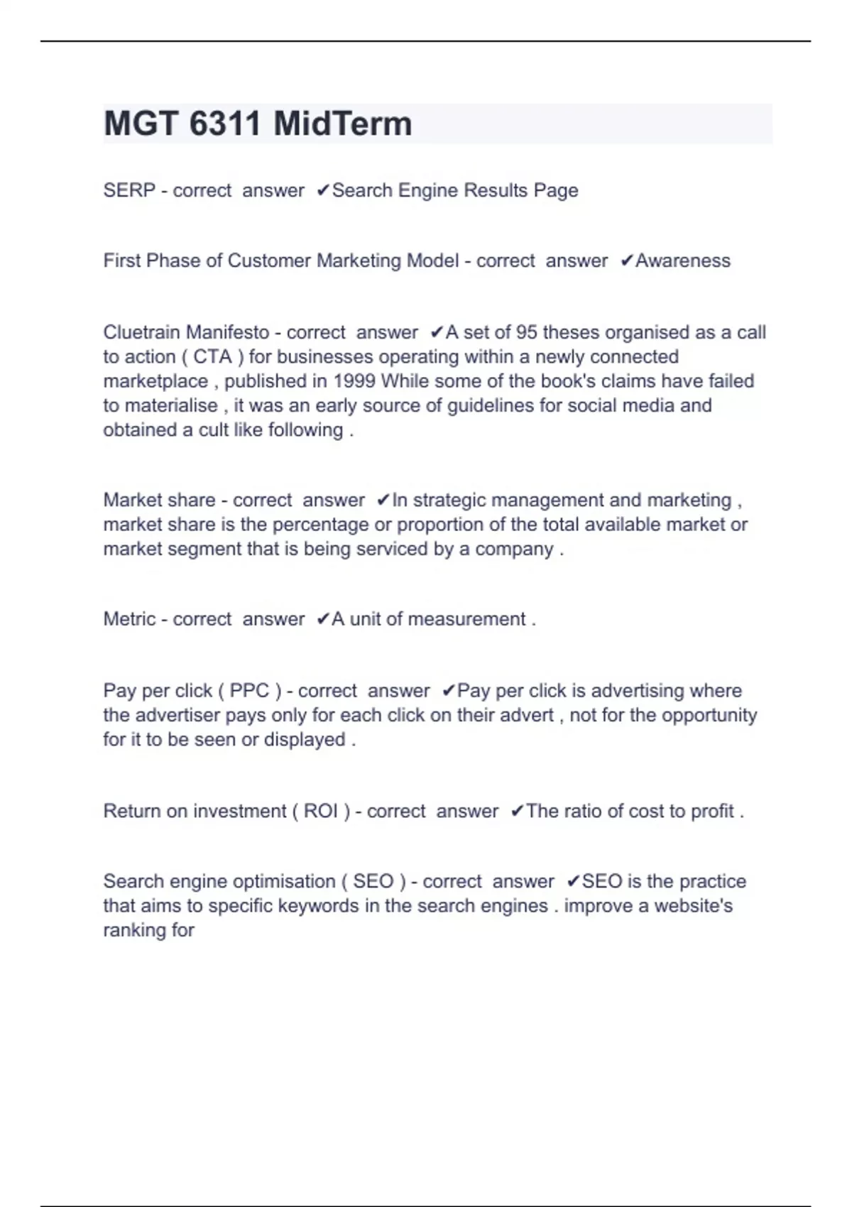 MGT 6311 Midterm Question and answer 100% correct MGT 6311 MidTerm SERP - correct answer Search Engine Results Page First Phase of Customer Marketing Model - correct answer Awareness Cluetrain Manifesto - correct answer A set of 95 theses organised as a call to action ( CTA ) for businesses operating within a newly connected marketplace , published in 1999 While some of the book's claims have failed to materialise , it was an early source of guidelines for social media and obtained a cult like following . Market share - correct answer In strategic management and marketing , market share is the percentage or proportion of the total available market or market segment that is being serviced by a company . Metric - correct answer A unit of measurement . Pay per click ( PPC ) - correct answer Pay per click is advertising where the advertiser pays only for each click on their advert , not for the opportunity for it to be seen or displayed . Return on investment ( ROI ) - correct answer The ratio of cost to profit . Search engine optimisation ( SEO ) - correct answer SEO is the practice that aims to specific keywords in the search engines . improve a website's ranking for Short Message Service ( SMS ) - correct answer Electronic messages sent on a cellular network . Strategy - correct answer and achieve its A set of ideas that outline how a product or brand will be positioned distribute , promote and objectives . This guides decisions price the product or service on how to create , Tactic - correct answer A specific action or method that contributes to achieving a goal