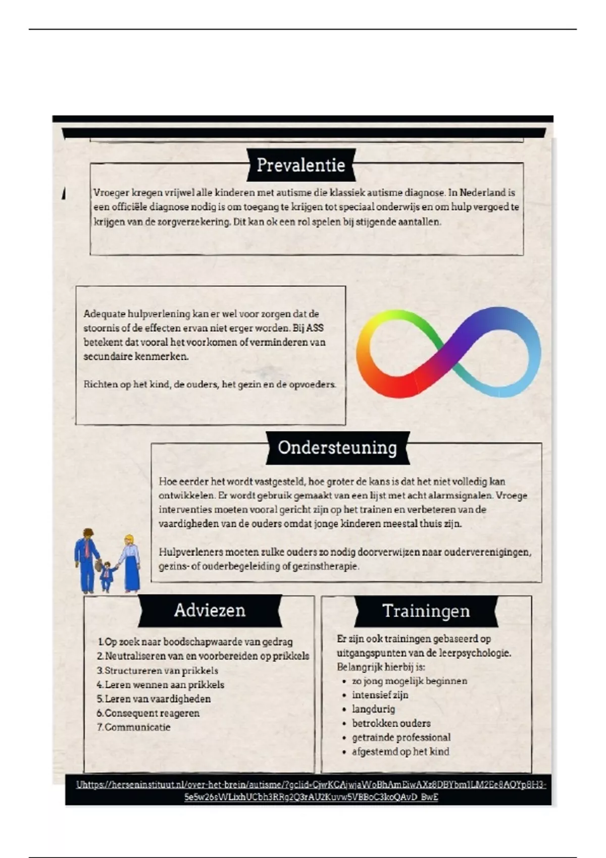 Infographic autismespectrumstoornis met informatie over de kernmerken, differentiaaldiagnose, comorbiditeit, prevalentie, handelingsadviezen, verschil in jongen en meisje, preventie en mogelijke behandeling.