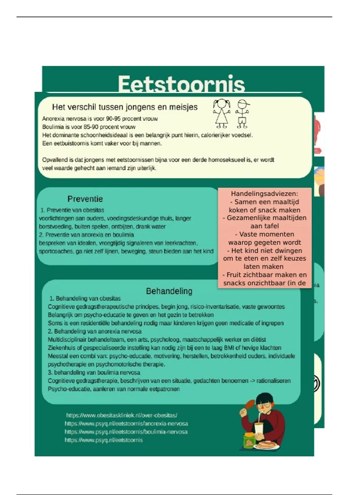 Infographic eetstoornis met informatie over de kernmerken, differentiaaldiagnose, comorbiditeit, prevalentie, handelingsadviezen, verschil in jongen en meisje, preventie en mogelijke behandeling.
