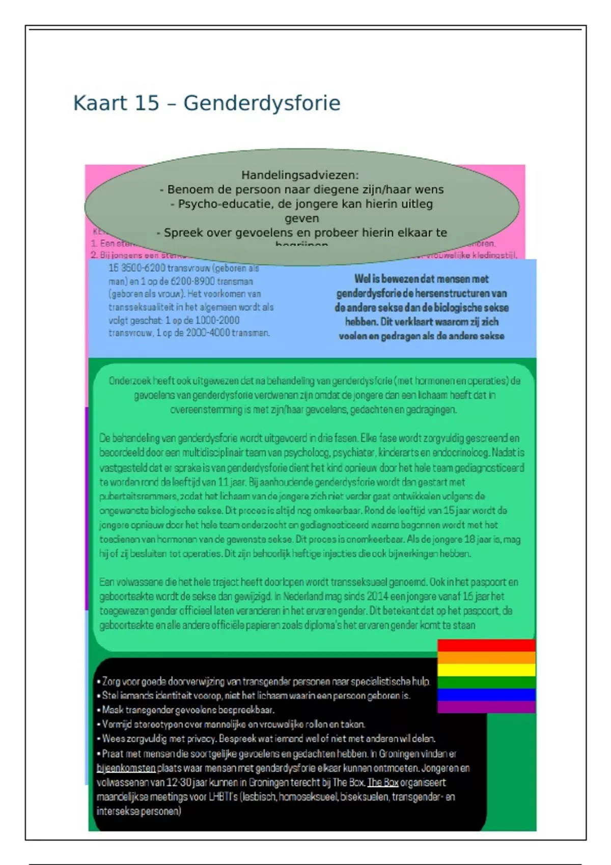 Infographic genderdysforie met informatie over de kernmerken, differentiaaldiagnose, comorbiditeit, prevalentie, handelingsadviezen, verschil in jongen en meisje, preventie en mogelijke behandeling.