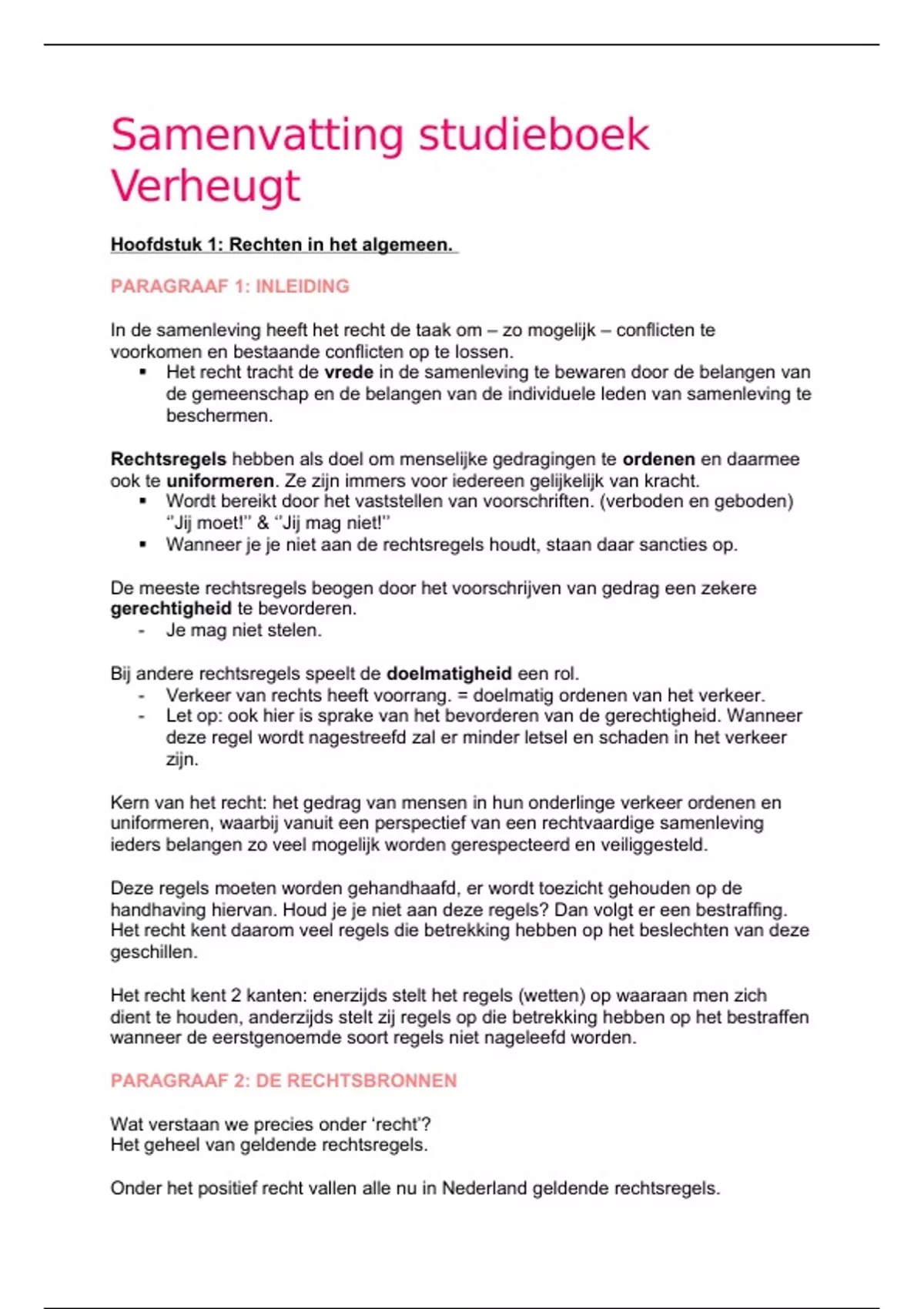 Samenvatting van de voorgeschreven stof uit 'Inleiding in het Nederlandse recht" (Verheugt) voor Inleiding tot de Rechtswetenschap (B1) aangevuld met schema's en stappenplannen.